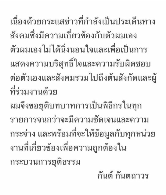 โดยกันต์เขียนข้อความว่า “เนื่องด้วยกระแสข่าวที่กำลังเป็นประเด็นทางสังคม ซึ่งมีความเกี่ยวข้องกับตัวผมเอง ตัวผมเองไม่ได้นิ่งนอนใจ และเพื่อเป็นการแสดงความบริสุทธิ์ใจและความรับผิดชอบต่อตัวเองและสังคม รวมไปถึงต้นสังกัดและผู้ที่ร่วมงานด้วย ผมจึงขอยุติบทบาทการเป็นพิธีกรในทุกรายการจนกว่าจะมีความชัดเจนและความกระจ่างและพร้อมที่จะให้ข้อมูลกับทุกหน่วยงานที่เกี่ยวข้องเพื่อความถูกต้องในกระบวนการยุติธรรม” โดยลงชื่อ “กันต์ กันตถาวร” อย่างชัดเจน