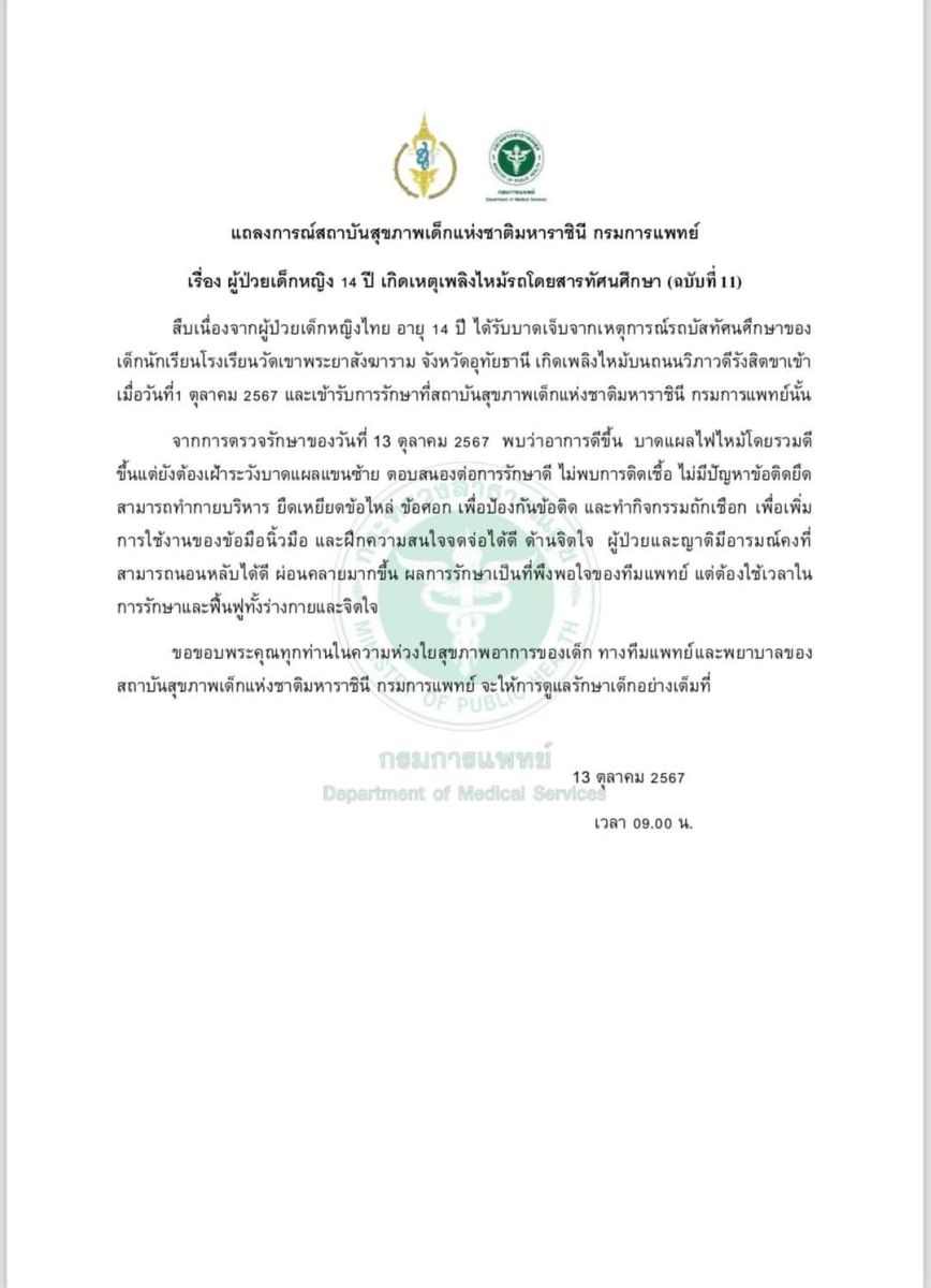 แถลงการณ์สถาบันสุขภาพเด็กแห่งชาติมหาราชินี กรมการแพทย์ เรื่อง ผู้ป่วยเด็กหญิง 14 ปี เกิดเหตุเพลิงไหม้รถโดยสารทัศนศึกษา (ฉบับที่ 11)