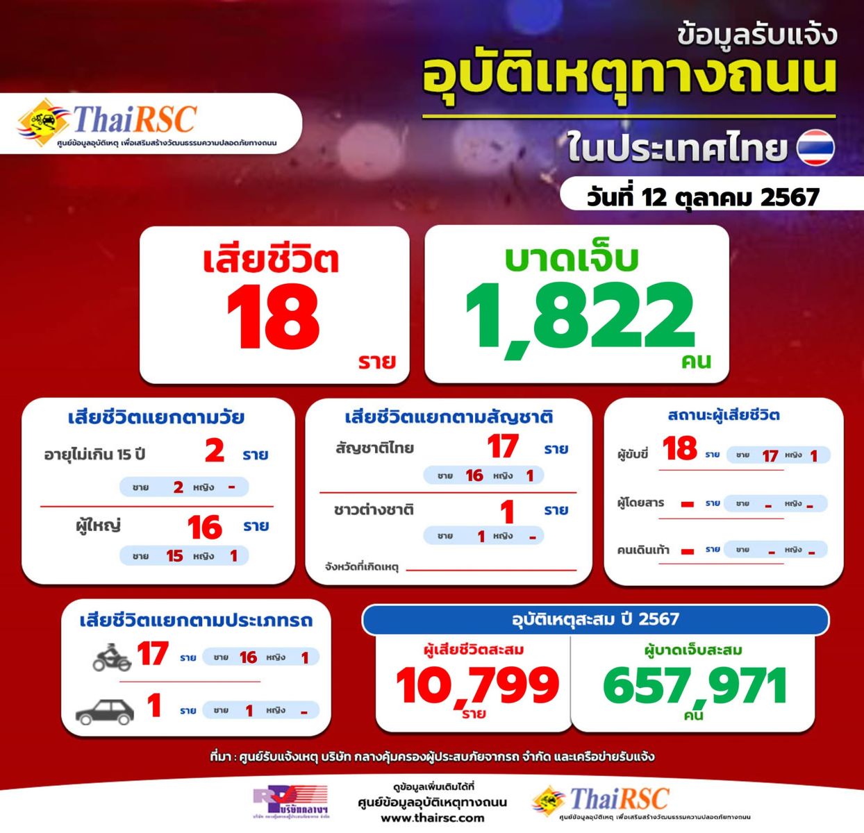 ศูนย์ข้อมูลอุบัติเหตุทางถนน (ThaiRSC) บริษัทกลางฯ เปิดเผยข้อมูลรับเเจ้งอุบัติเหตุทางถนนในรอบ 24 ชม. วันที่ 12 ตุลาคม 2567 ว่ามีผู้เสียชีวิต 18 ราย มีผู้ได้รับบาดเจ็บ 1,822 คน