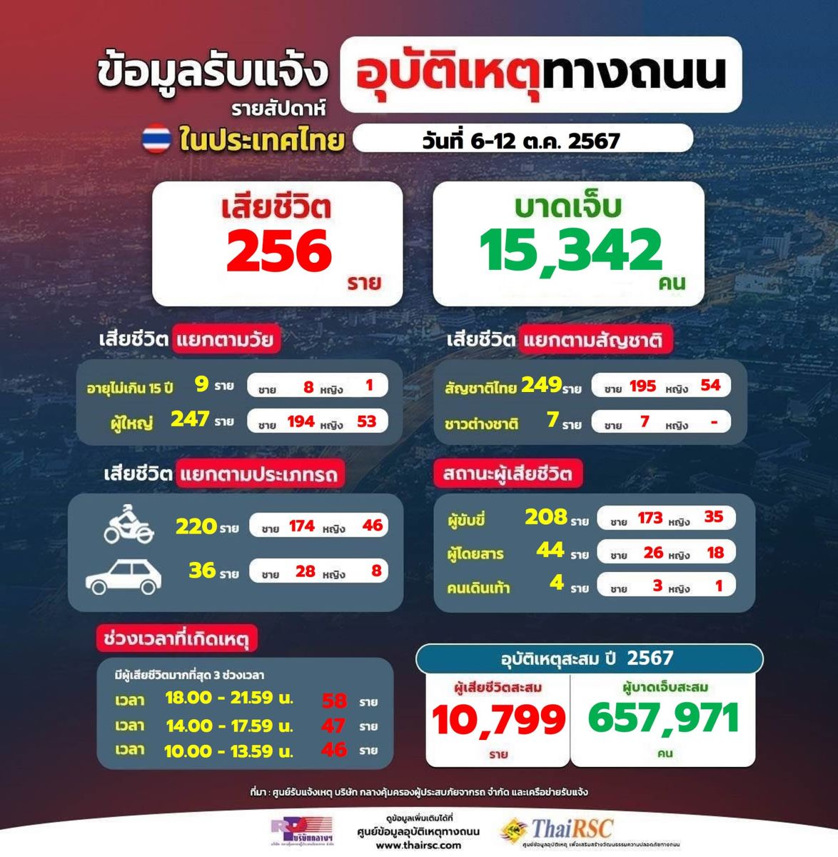 ส่วนข้อมูลรับเเจ้งอุบัติเหตุทางถนน รายสัปดาห์ ระหว่างวันที่ 6-12 ตุลาคม 2567 มีผู้เสียชีวิต 256 ราย บาดเจ็บ 15,342 คน