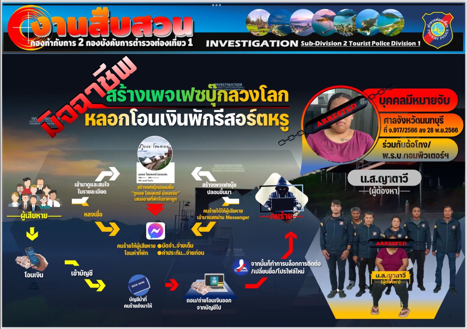 สืบท่องเที่ยว กก.2 บก.ทท.1 รวบเจ้าของบัญชีม้า หลอกโอนจองรีสอร์ตหรู และจับกุม 2 ไกด์เวียดนามเถื่อน พาลูกทัวร์เที่ยวพัทยา