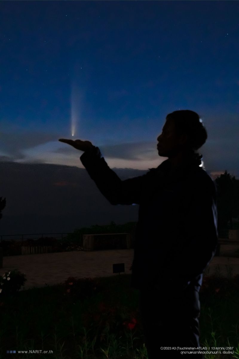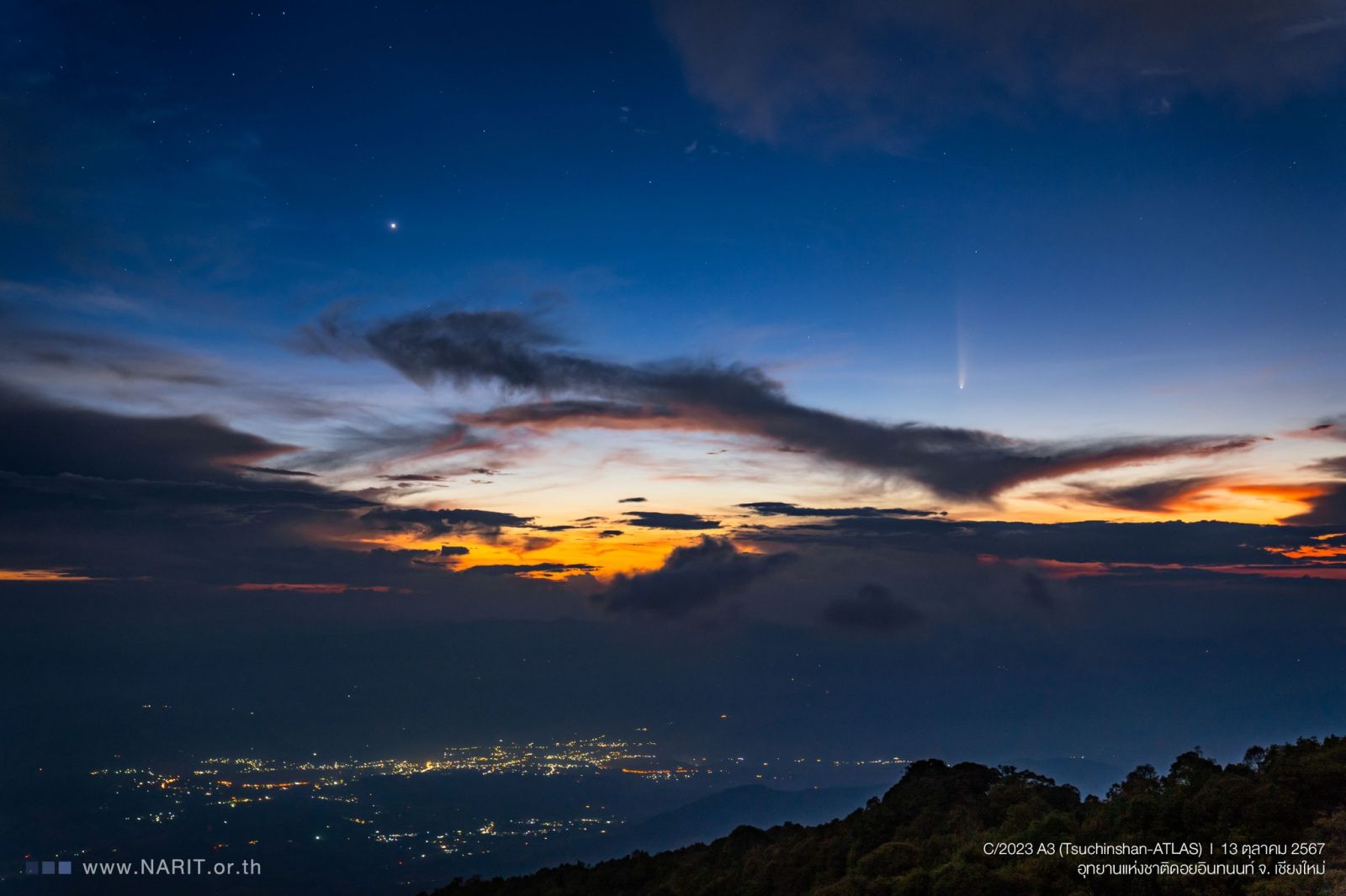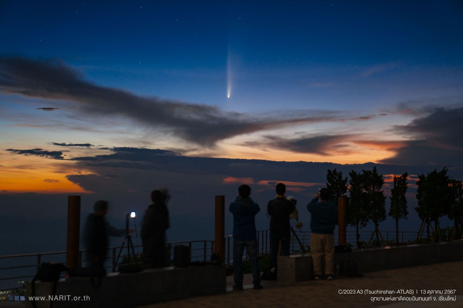 NARIT เผยภาพดาวหางจื่อจินซาน-แอตลัส หรือ C/2023 A3 (Tsuchinshan-ATLAS) ในวันใกล้โลกที่สุด บันทึกเมื่อช่วงหัวค่ำ วันที่ 13 ตุลาคม 2567 ณ อุทยานแห่งชาติดอยอินทนนท์ จ. เชียงใหม่ ปรากฏให้เห็นทางทิศตะวันตก พาดสว่างเหนือฟ้าจังหวัดเชียงใหม่ หากท้องฟ้าใสไร้เมฆ และอยู่ในพื้นที่ที่มีแสงรบกวนน้อย สามารถเห็นหางของดาวหางได้ด้วยตาเปล่า สวยงามมาก