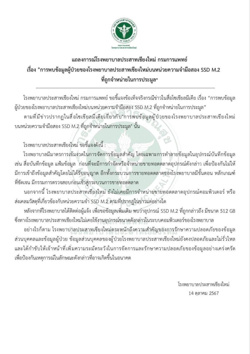 โรงพยาบาลประสาทเชียงใหม่ กรมการแพทย์ ขอชี้แจงข้อเท็จจริงกรณีข่าวในสื่อโซเชียลมีเดีย เรื่อง "การพบข้อมูลผู้ป่วยของโรงพยาบาลประสาทเชียงใหม่บนหน่วยความจำมือสอง SSD M.2 ที่ถูกจำหน่ายในการประมูล"