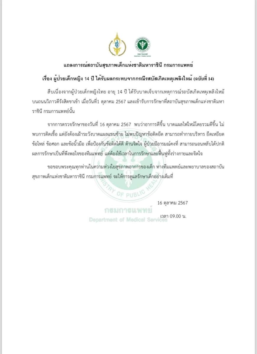 แถลงการณ์สถาบันสุขภาพเด็กแห่งชาติมหาราชินี กรมการแพทย์ เรื่อง ผู้ป่วยเด็กหญิง 14 ปี ได้รับผลกระทบจากกรณีรสบัสเกิดเหตุเพลิงไหม้ (ฉบับที่ 14)