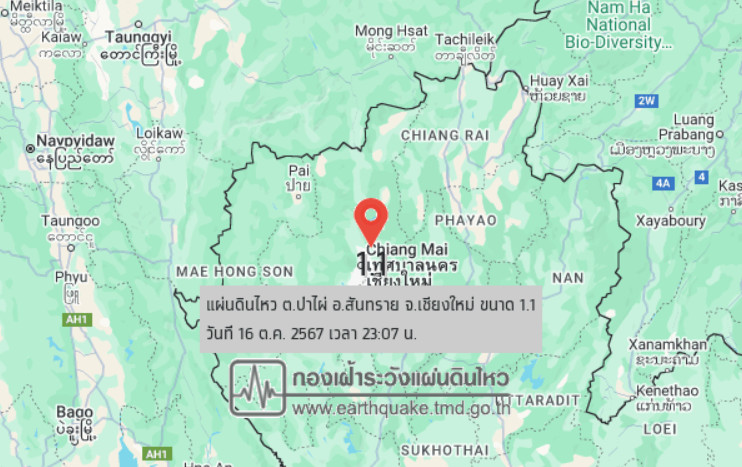 เวลา 23.07 น. วันที่ 16 ตุลาคม 2567 กองเฝ้าระวังแผ่นดินไหว กรมอุตุนิยมวิทยา แจ้งเหตุแผ่นดินไหว ขนาด 1.1 ความลึก 2 กม. (18.94°N,99.08°E) ภายในพื้นที่ของ ต.ป่าไผ่ อ.สันทราย จ.เชียงใหม่ ยังไม่มีรายงานผลกระทบจากแรงสั่นสะเทือน