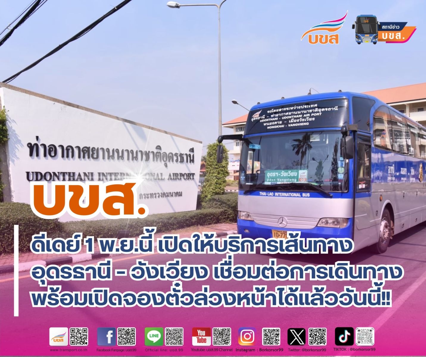 17 ตุลาคม 2567 นายอรรถวิท รักจำรูญ กรรมการฯ รักษาการแทนกรรมการผู้จัดการใหญ่ บริษัท ขนส่ง จำกัด (บขส.) เปิดเผยว่า ตั้งแต่วันที่ 1 พ.ย.2567 เป็นต้นไป บขส. จะกลับมาเปิดให้บริการเดินรถระหว่างประเทศ ไทย - ลาว เส้นทางที่ 9 อุดรธานี - ท่าอากาศยานนานาชาติอุดรธานี - หนองคาย – วังเวียง เพื่ออำนวยความสะดวกนักท่องเที่ยว ในช่วงฤดูหนาว เกิดการเดินทางเชื่อมต่อระหว่างสนามบิน และรถไฟความเร็วสูง ลาว - จีน ที่สะดวก รวดเร็วและไร้รอยต่อ ตามนโยบายนายสุรพงษ์ ปิยะโชติ รัฐมนตรีช่วยว่าการกระทรวงคมนาคม