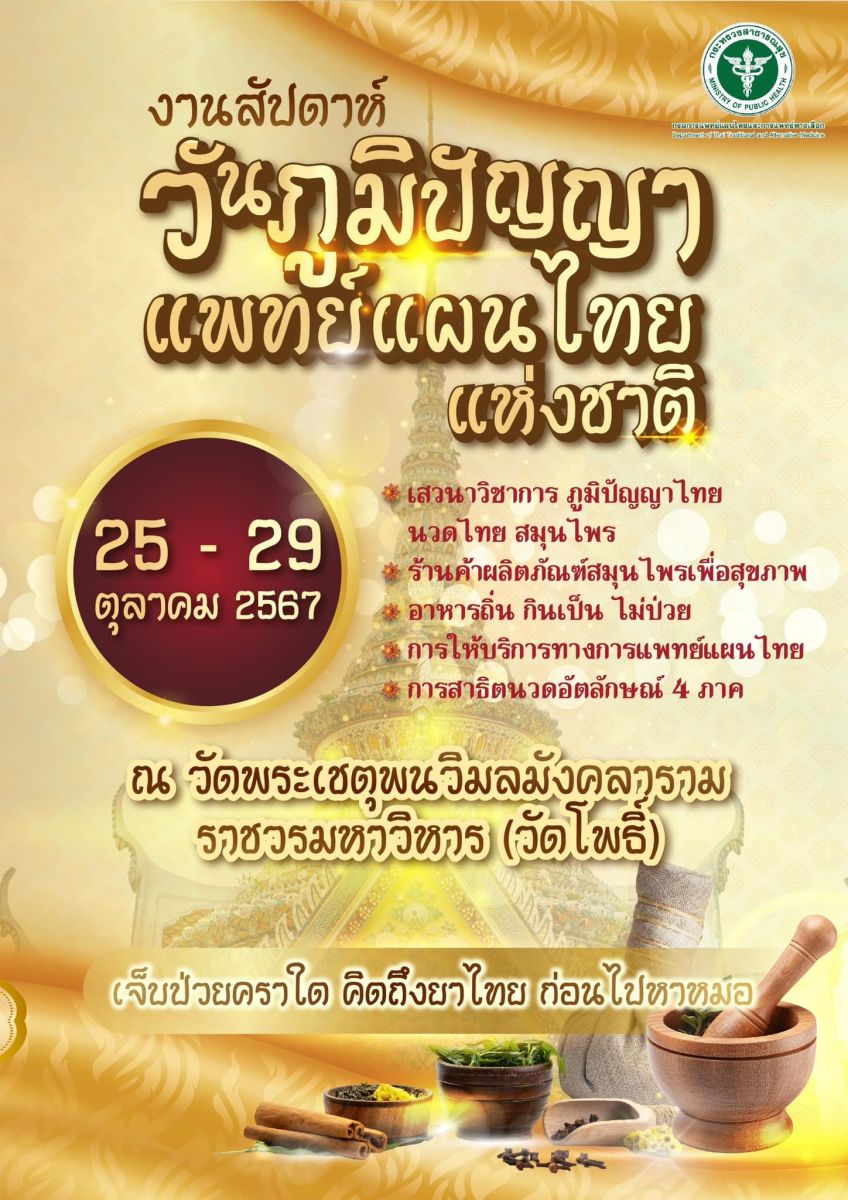 งานสัปดาห์วันภูมิปัญญาแพทย์แผนไทยแห่งชาติ วันที่ 25 - 29 ตุลาคม 2567 ณ วัดพระเชตุพนวิมลมังคลาราม ราชวรมหาวิหาร (วัดโพธิ์)