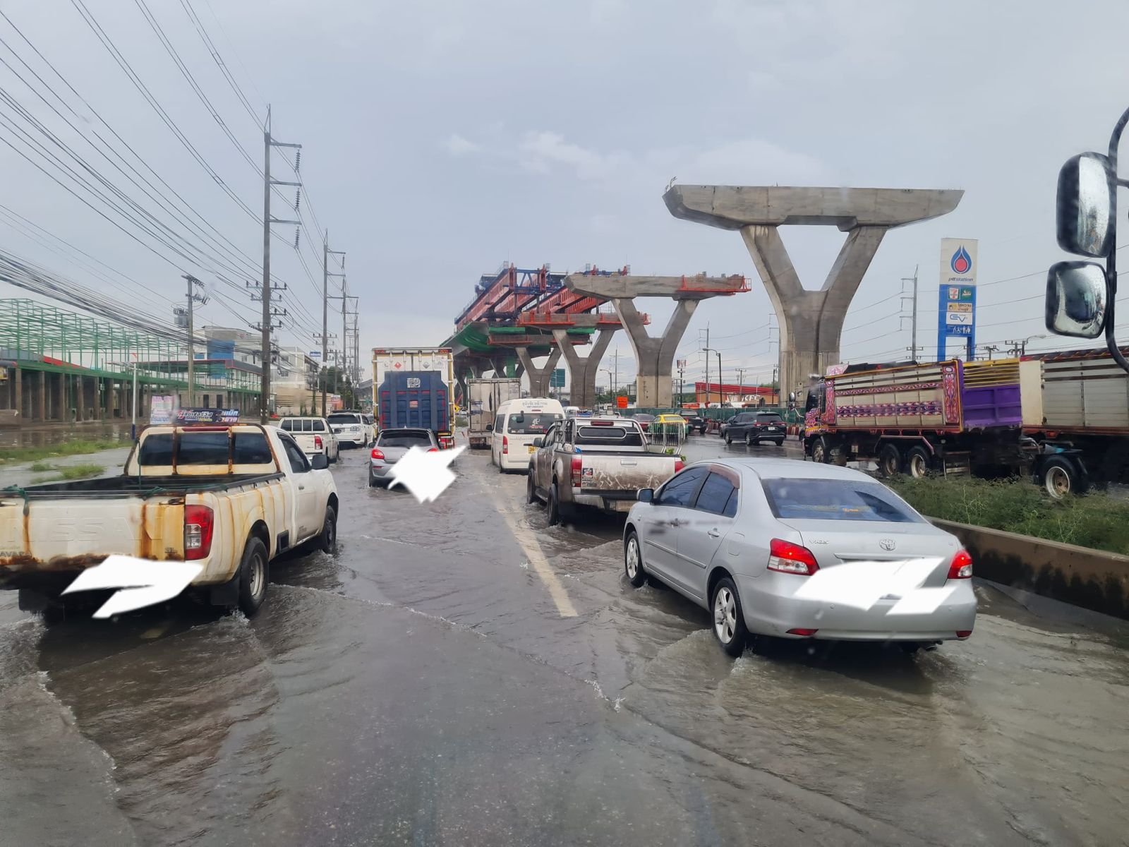 ถนนพระราม 2 ขาออก มีน้ำท่วมขังหลายจุด 'หัวแถว' อยู่ตรงสะพานข้ามคลองตาขำ (โรงเรียนสารสาสน์วิเทศสมุทรสาคร) 'ท้ายแถว' สะสมอยู่ที่ทางลงสะพานข้ามแม่น้ำท่าจีน ราวๆ 8 กม.
