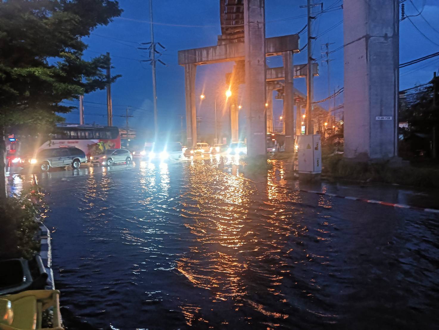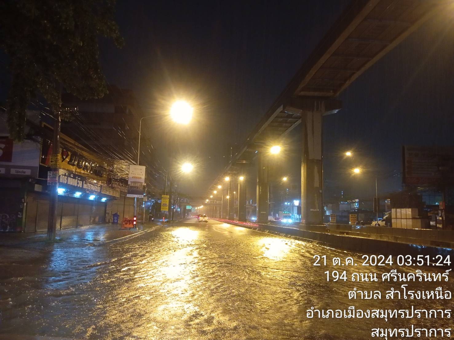 แยกศรีเทพา น้ำท่วมถนนเทพารักษ์ ขาเข้า ช่องทางด้านซ้ายตั้งแต่ตลาดศรีสมิตร เลี้ยวซ้ายเข้าถนนศรีนครินทร์ท่วมเสมอฟุตปาธ