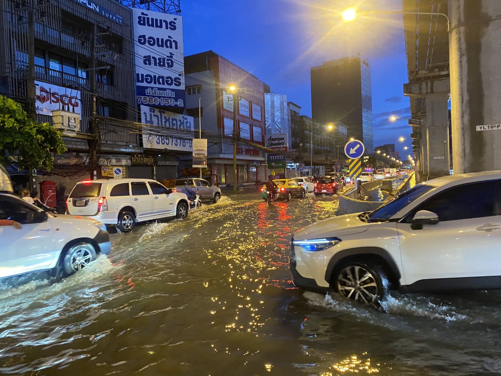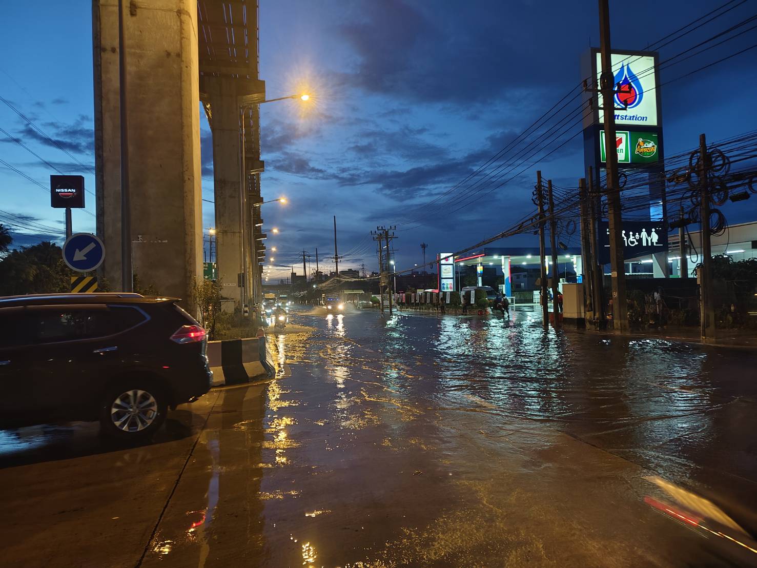 ถนนเทพารักษ์ ขาเข้า ตั้งแต่ หมู่บ้านศศิกานต์ ถึงทางขึ้นสะพานข้ามคลองทิพวัล ท่วม 3 ช่องทาง และ 2 ช่องทางบางช่วง