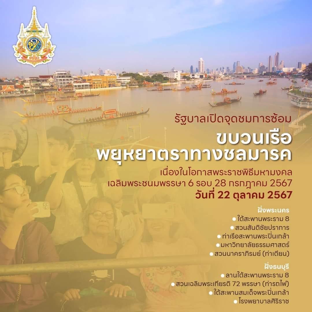 รัฐบาลเปิดจุดชมการซ้อมขบวนเรือพยุหยาตราทางชลมารค เนื่องในโอกาสพระราชพิธี มหามงคลเฉลิมพระชนมพรรษา 6 รอบ 28 กรกฎาคม 2567 วันที่ 22 ตุลาคม 2567