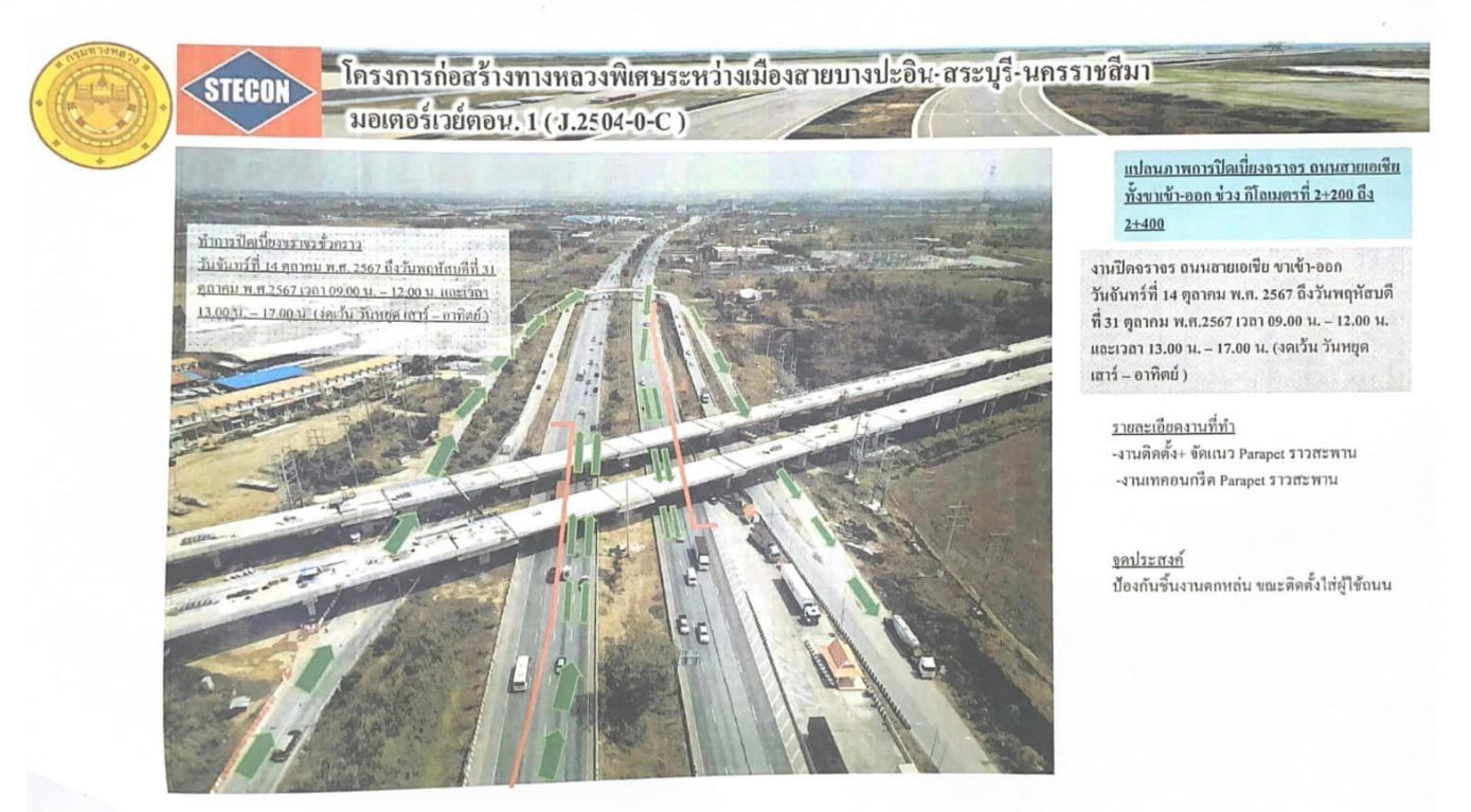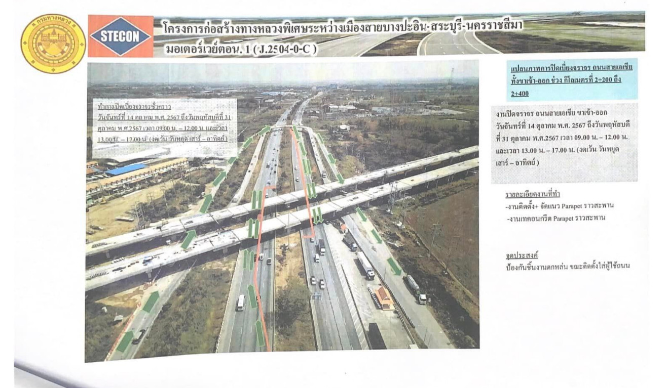 แขวงทางหลวงอยุธยา กรมทางหลวง แจ้งข่าวโครงการจ้างเหมาก่อสร้างทางพิเศษระหว่างเมือง (บางปะอิน-สระบุรี-นครราชสีมา) กม.0-กม.7+332 (รวมทางแยกต่างระดับบางปะอิน 2) ระยะทางยาว 7.3 กิโลเมตร โดยนายช่างโครงการแจ้งว่าจะดำเนินการก่อสร้างสะพาน Overpass Bridge WB1 Span P24R - P25R, P26L - P28L รวม 3 Span บนทางหลวงหมายเลข 32 (สายเอเชีย) ระหว่างกม.2+200 ถึง กม.2+400 ขาเข้า และขาออก จำเป็นต้องทำการเบี่ยงจราจรชั่วคราว ในวันที่ 21 ตุลาคม 2567 ถึงวันที่ 31 ตุลาคม 2567 (ยกเว้น วันเสาร์-อาทิตย์)