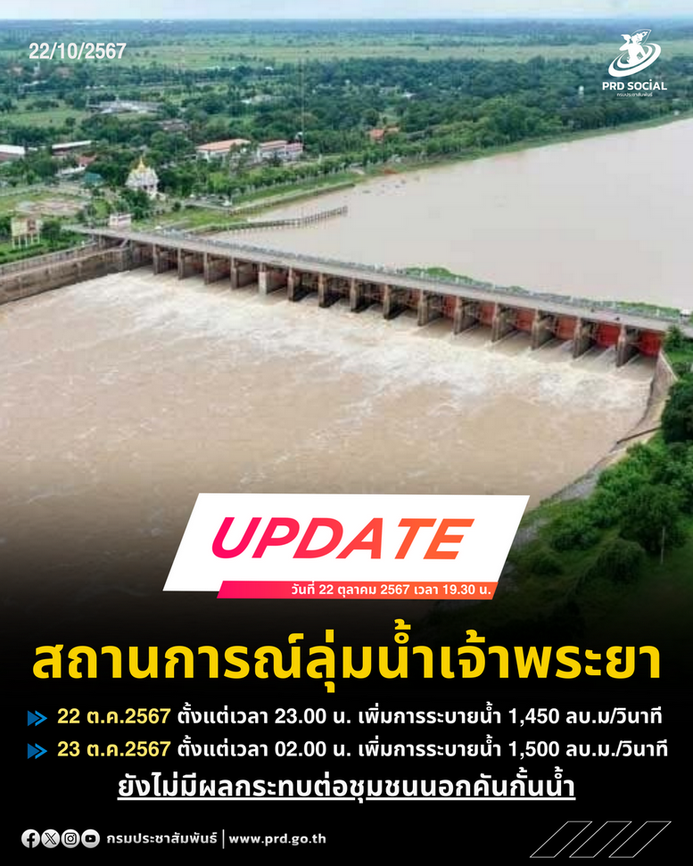 วันที่ 22 ตุลาคม 2567 เวลา 20.00 น. ทยอยเพิ่มจากอัตรา 1,399 ลบ.ม./วิ เป็นอัตรา 1,450 ลบ.ม./วิ ในเวลา 23.00 น. และคงอัตราดังกล่าวต่อเนื่อง