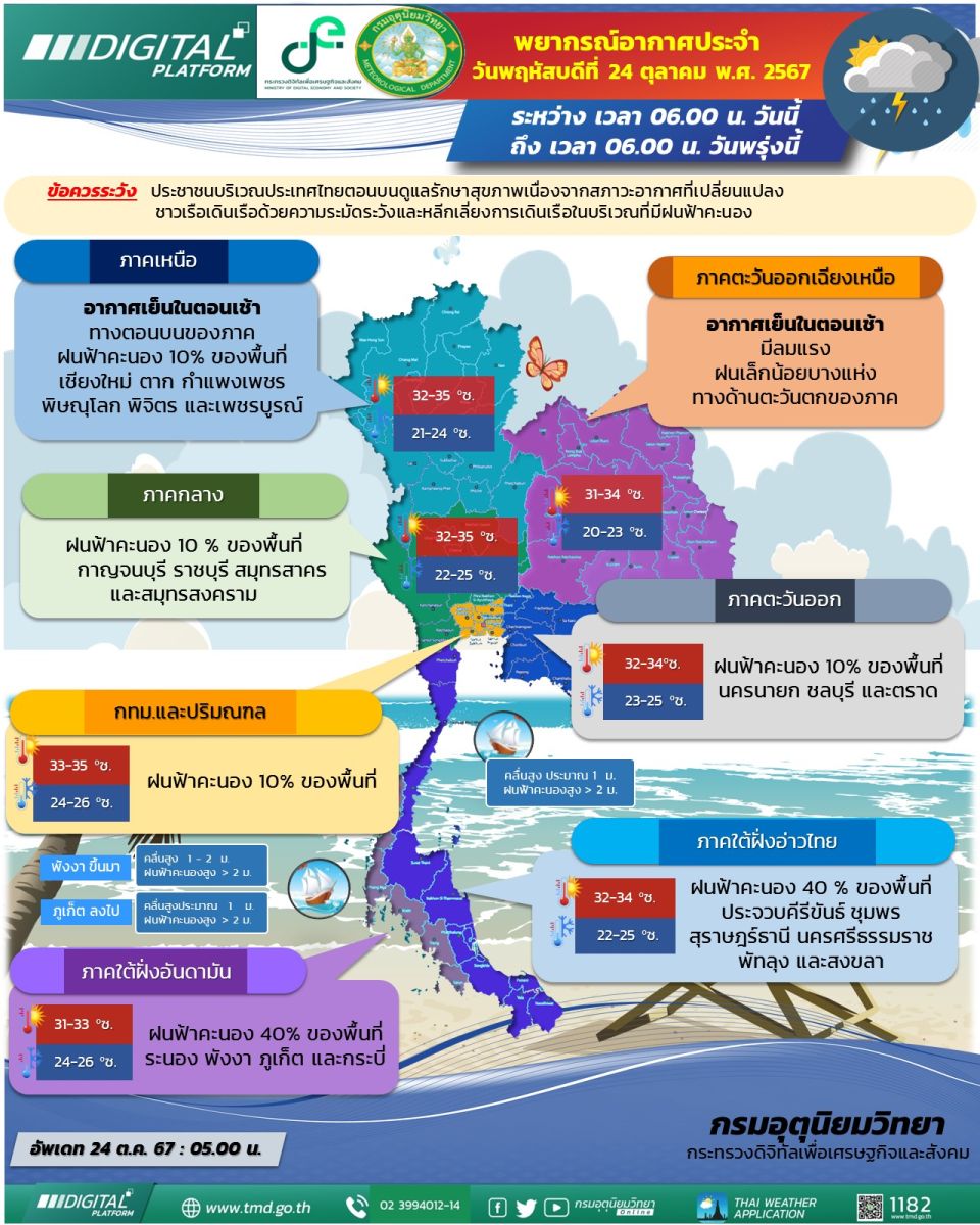 ลักษณะอากาศทั่วไป วันที่ 24 ตุลาคม 2567 พยากรณ์อากาศ 24 ชั่วโมงข้างหน้า ประเทศไทยตอนบนมีฝนน้อย แต่ยังคงมีฝนฟ้าคะนองเกิดขึ้นได้บางพื้นที่ โดยภาคตะวันออกเฉียงเหนือและภาคเหนือตอนบนมีอากาศเย็นในตอนเช้า กับมีลมแรง ขอให้ประชาชนบริเวณประเทศไทยตอนบนดูแลรักษาสุขภาพเนื่องจากสภาวะอากาศที่เปลี่ยนแปลง