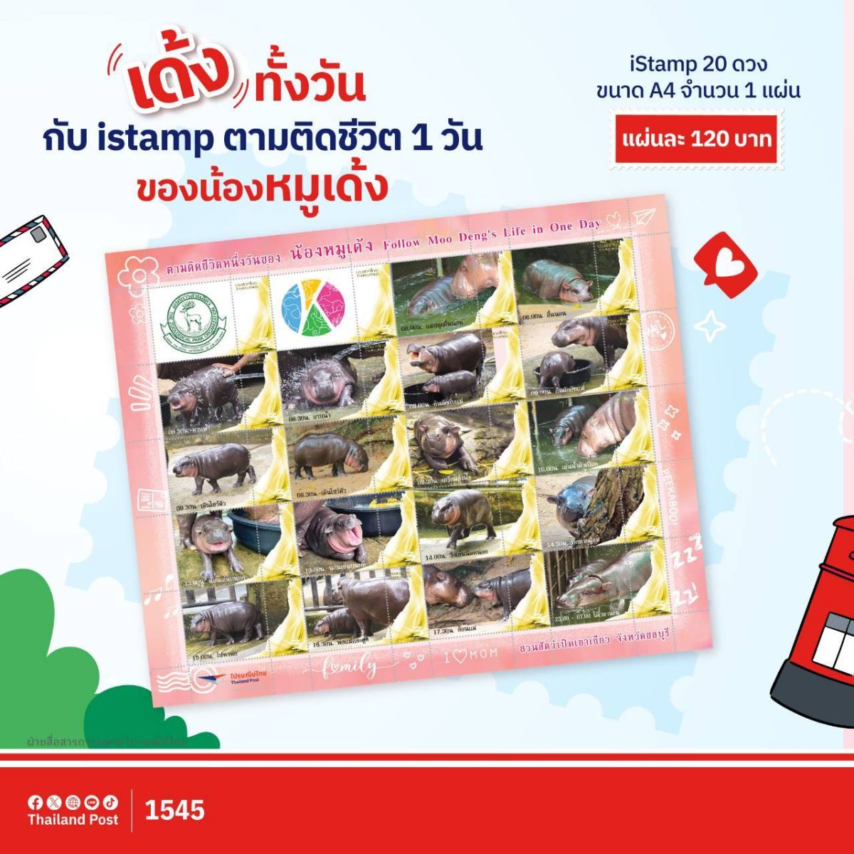 - iStamp ตามติดชีวิตหนึ่งวันของน้องหมูเด้ง 20 ดวง (ขนาด A4) ราคาแผ่นละ 120 บาท