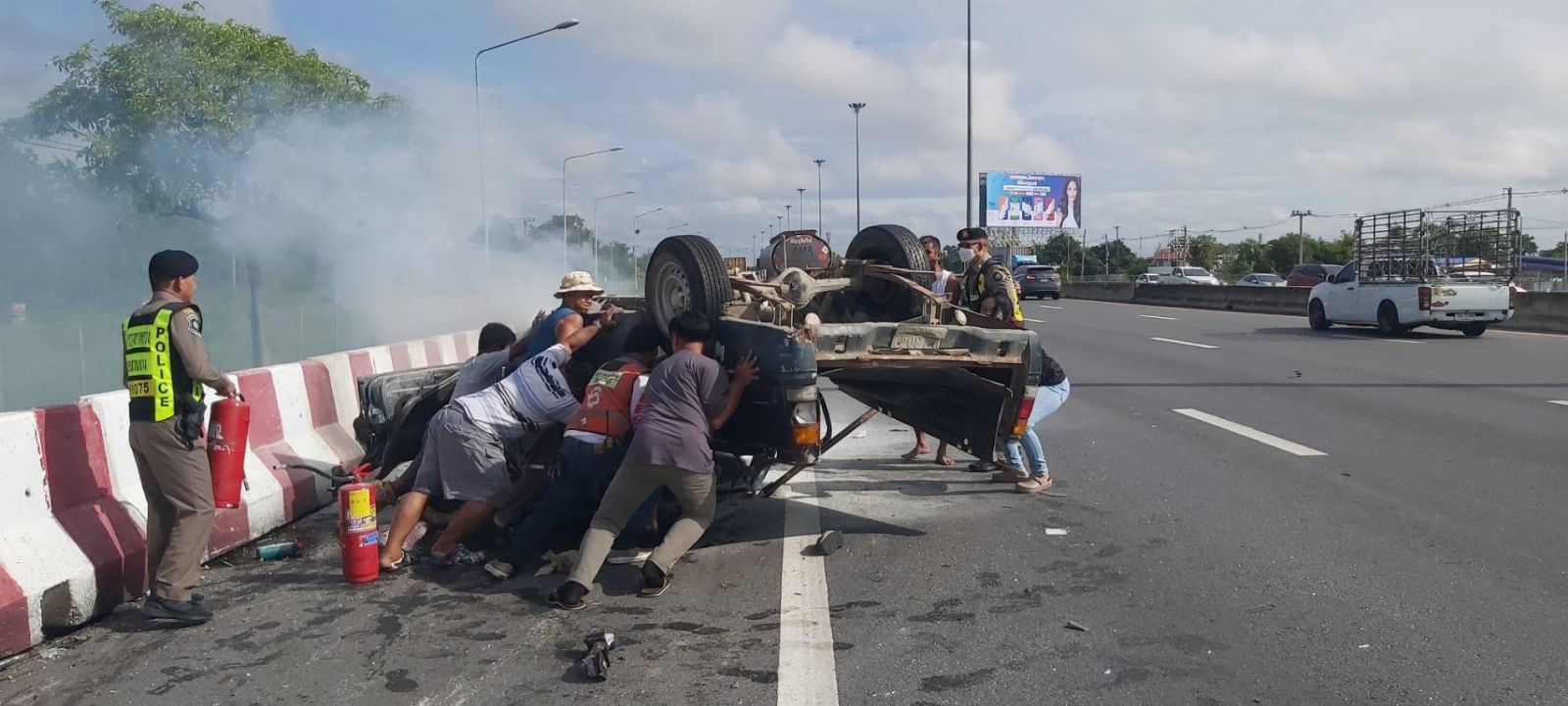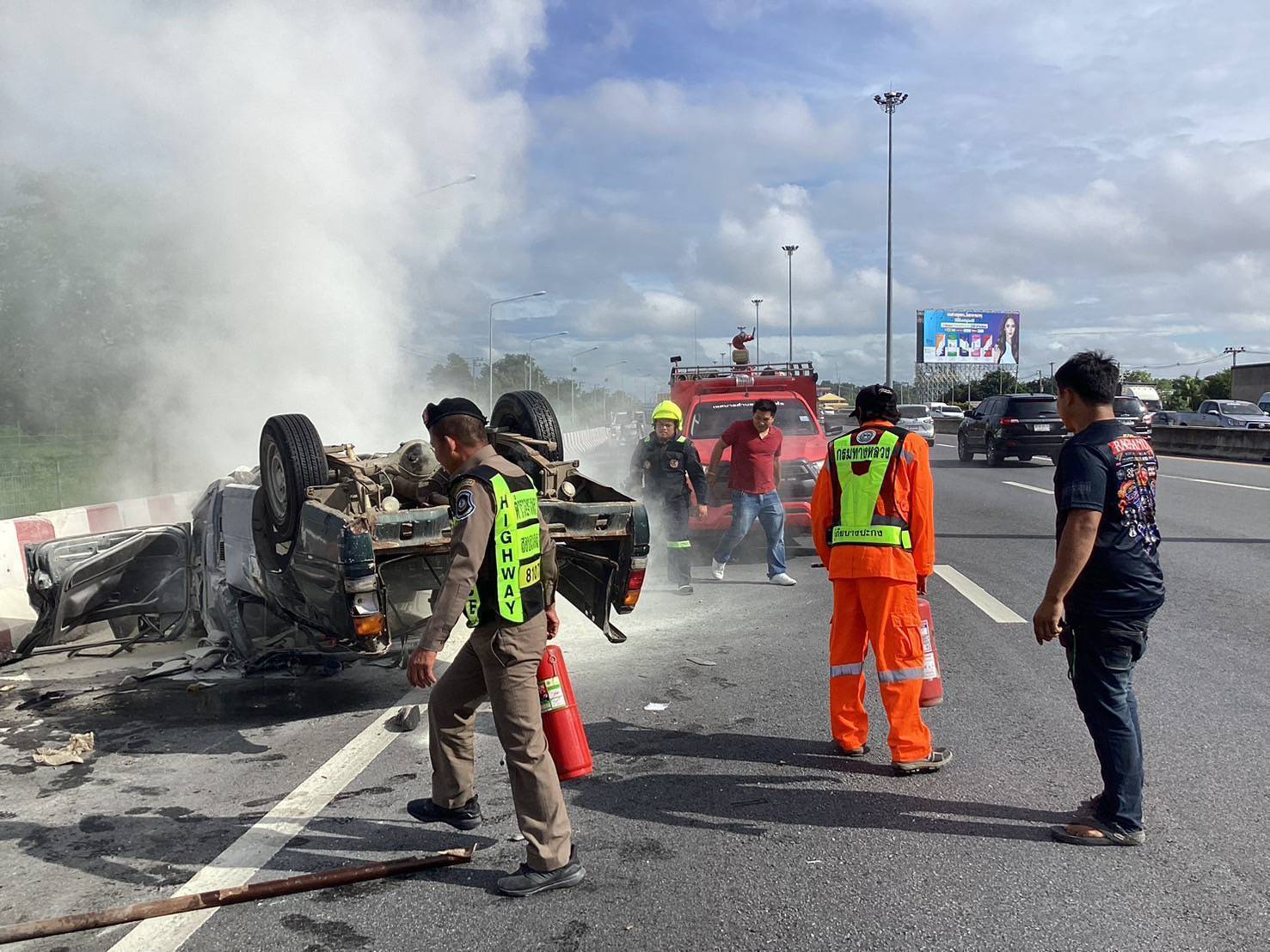ขณะนั้นเพลิงโหมแรงขึ้น มีแนวโน้มว่าจะไม่สามารถควบคุมเพลิงได้ จนท.ตำรวจทางหลวงจึงได้ช่วยกันส่งสัญญาณขอรับการสนับสนุนถังดับเพลิงจากรถบรรทุกพ่วงที่ขับผ่านมา อีก 2 ถัง เพื่อนำมาระดมฉีดดับเพลิง จนสามารถควบคุมเพลิงได้ ก่อนนำผู้บาดเจ็บออกมาจากรถและปฐมพยาบาลเบื้องต้นได้อย่างอย่างปลอดภัย จากนั้นได้นำตัวผู้บาดเจ็บส่งโรงพยาบาลเพื่อเข้ารับการรักษาต่อไป