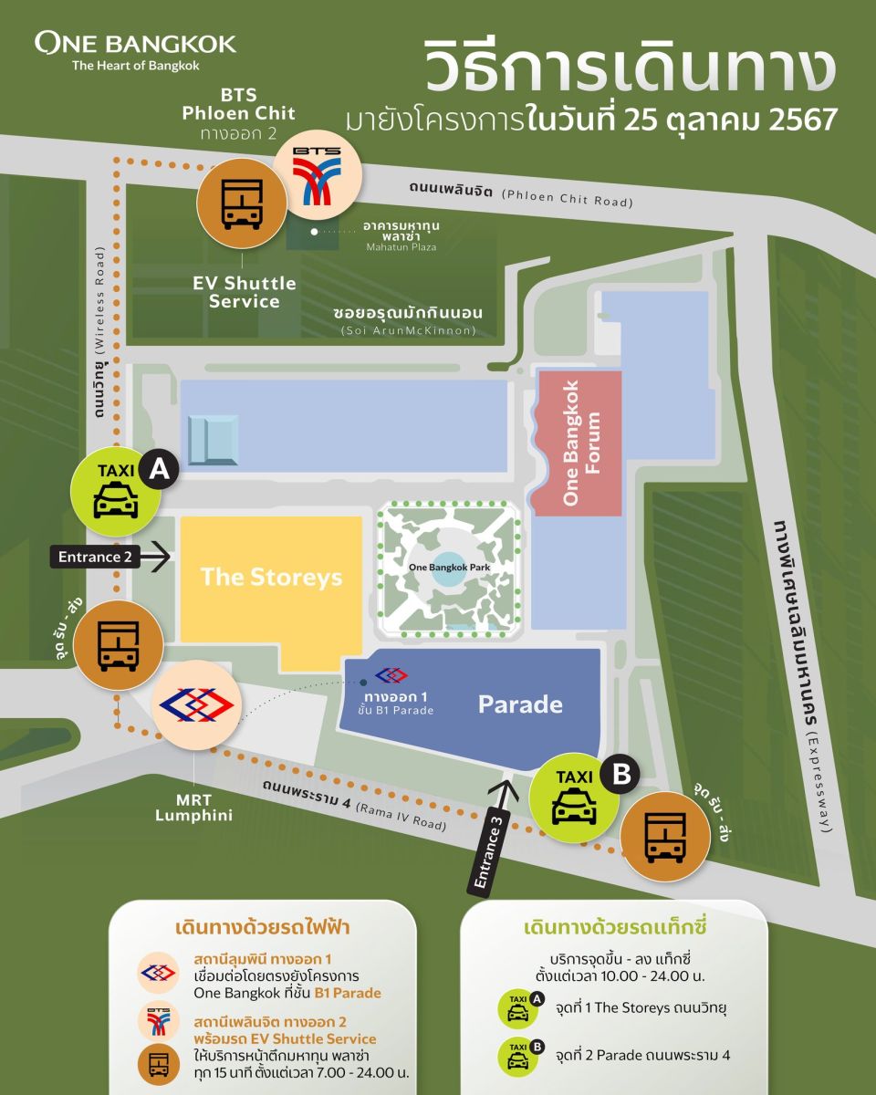 วิธีการเดินทางไปยังโครงการ วัน แบงค็อก โดยเฉพาะในวันที่ 25 ตุลาคม 2567 ซึ่งเป็นมีงานเปิดอย่างเป็นทางการ ทางโครงการแนะนำวิธีการเดินทางเพื่ออำนวยความสะดวก ดังนี้