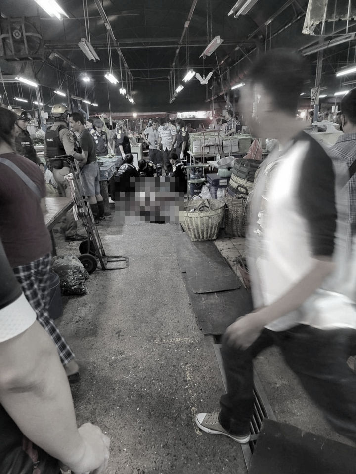 หนุ่มต่างด้าวถูกแทงด้วยอาวุธมีด มีแผลที่หน้าขา ก่อนจะเสียชีวิตในเวลาต่อมา ภายในตลาดย่านบางกะปิ