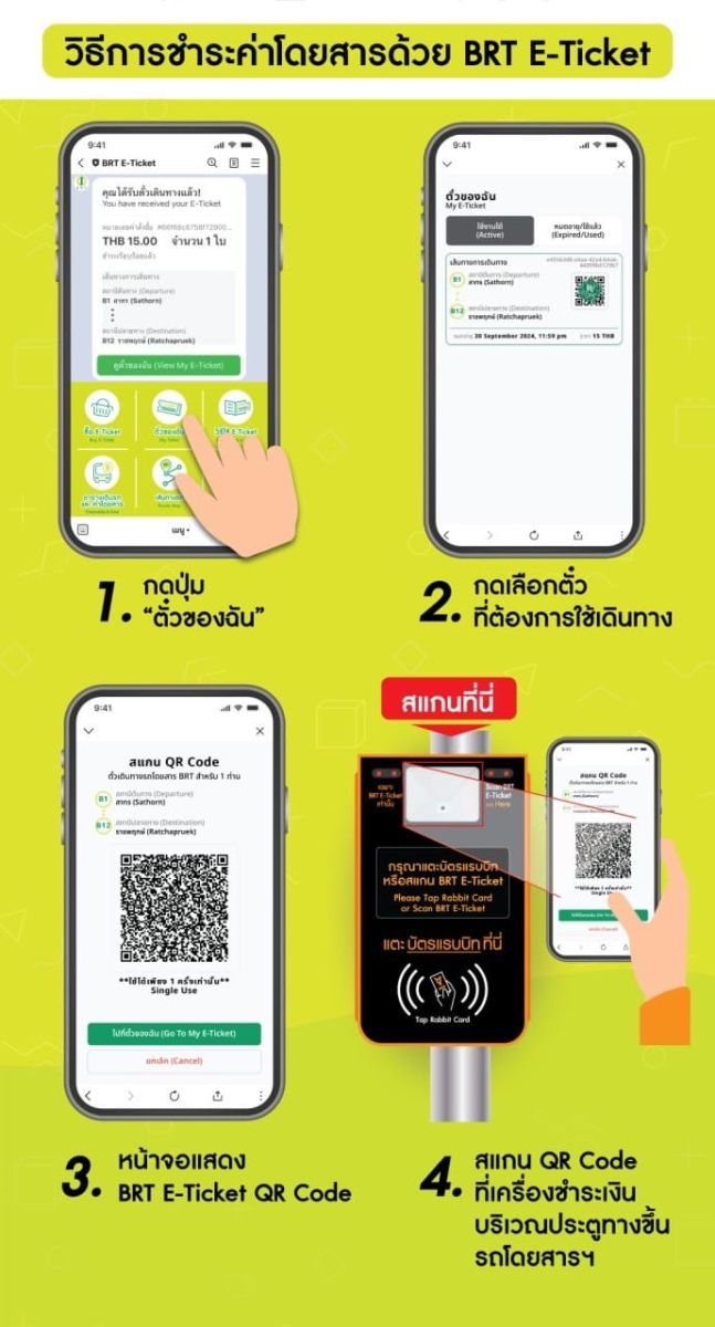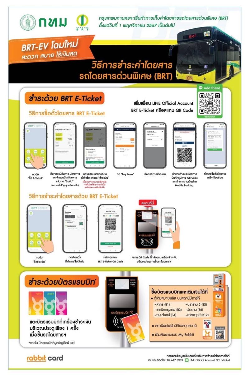 โดยในส่วนนี้ ได้มีการประชาสัมพันธ์ให้ประชาชนรับทราบล่วงหน้า 1 เดือน เพื่อให้ประชาชนเตรียมวางแผนการชำระเงิน และจะมีการจัดพนักงานแนะนำทุกสถานีช่วงเริ่มต้นการชำระเงิน รวมทั้งมีการแจกบัตรฟรีเพื่อประชาสัมพันธ์ให้แก่ผู้ใช้บริการในรถ และ 2. ชำระด้วย BRT E-Ticket ในการซื้อตั๋วเที่ยวเดียวเพื่อสแกนกับเครื่องชำระเงินบนตัวรถ ทำได้โดยเพิ่มเพื่อน LINE Official Account BRT E-Ticket ซึ่งปัจจุบันมีสมาชิกใน LINE แล้วประมาณ 1,600 คน