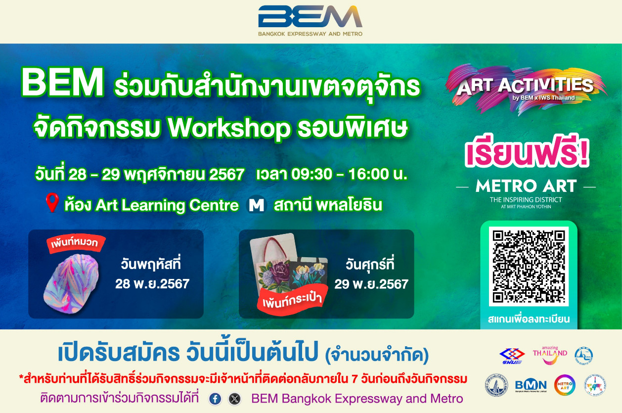 แล้วพบกันในกิจกรรม Art Activities รอบพิเศษจาก BEM และสำนักงานเขตจตุจักร ในวันที่ 28 และ 29 พฤศจิกายน 2567 เวลา 09.30 – 16.00 ณ ห้อง Art Learning Centre Metro Art @MRT สถานีพหลโยธิน ผู้สนใจสามารถสมัครเข้าร่วมกิจกรรมล่วงหน้าได้ฟรี !! ตั้งแต่วันนี้เป็นต้นไป (รับจำนวนจำกัด) ผ่านทาง QR Code หรือ https://shorturl.asia/OrjR2 สามารถติดตามรายละเอียดเพิ่มเติมได้ที่ Facebook (เฟซบุ๊ก) และ X (เอ็กซ์) : BEM Bangkok Expressway and Metro