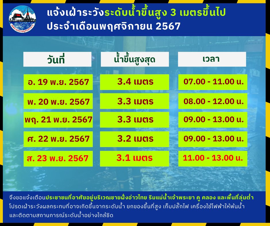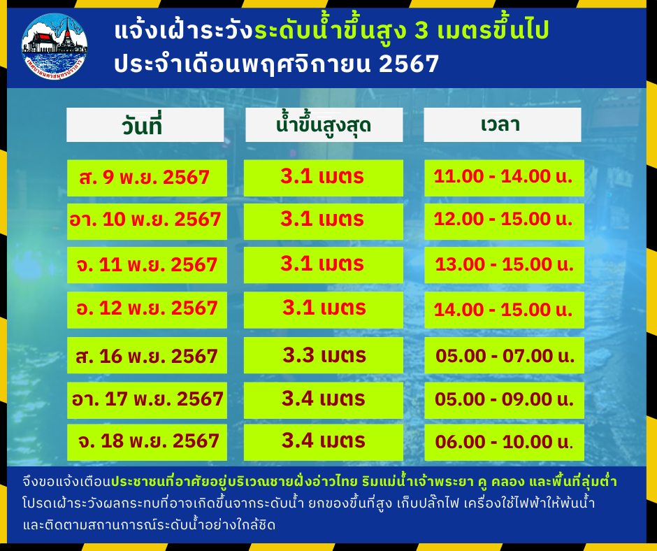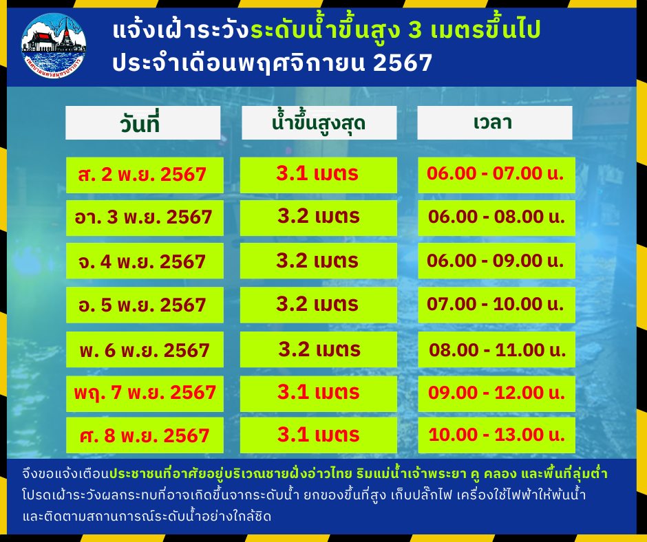 เทศบาลนครสมุทรปราการ แจ้งประชาสัมพันธ์ เฝ้าระวังระดับน้ำสูงกว่า 3 เมตรขึ้นไปในเขตพื้นที่ ประจำเดือนพฤศจิกายน 2567