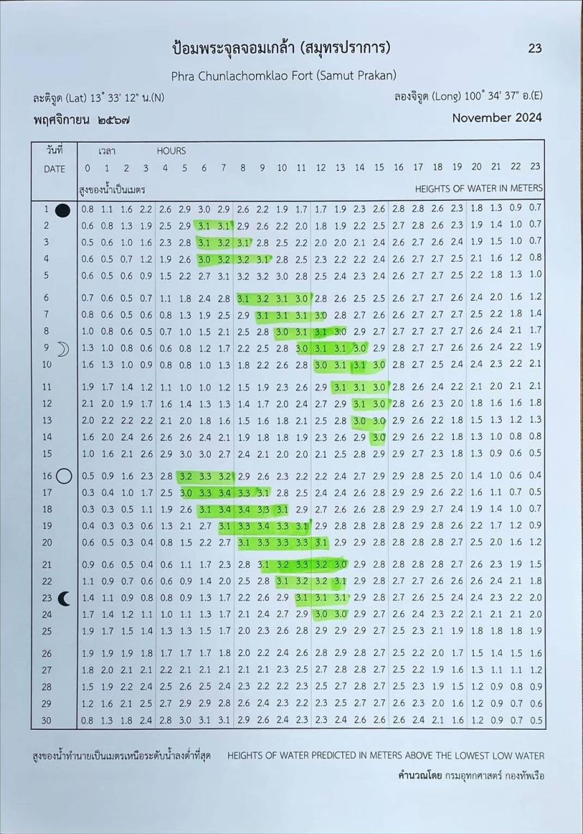 สถานีป้อมพระจุลจอมเกล้า กรมอุทกศาสตร์ กองทัพเรือ แจ้งเตือนประชาชนเฝ้าระวังระดับน้ำสูงกว่า 3 เมตรขึ้นไป เหนือระดับน้ำทะเลต่ำสุด ในช่วงเดือนพฤศจิกายน 2567 โดยอาจส่งผลให้เกิดภาวะน้ำท่วมฉับพลัน ที่กระทบต่อผู้ที่อาศัยในบริเวณชายฝั่งอ่าวไทย ริมแม่น้ำ คู คลอง และพื้นที่ลุ่มต่ำต่าง ๆ