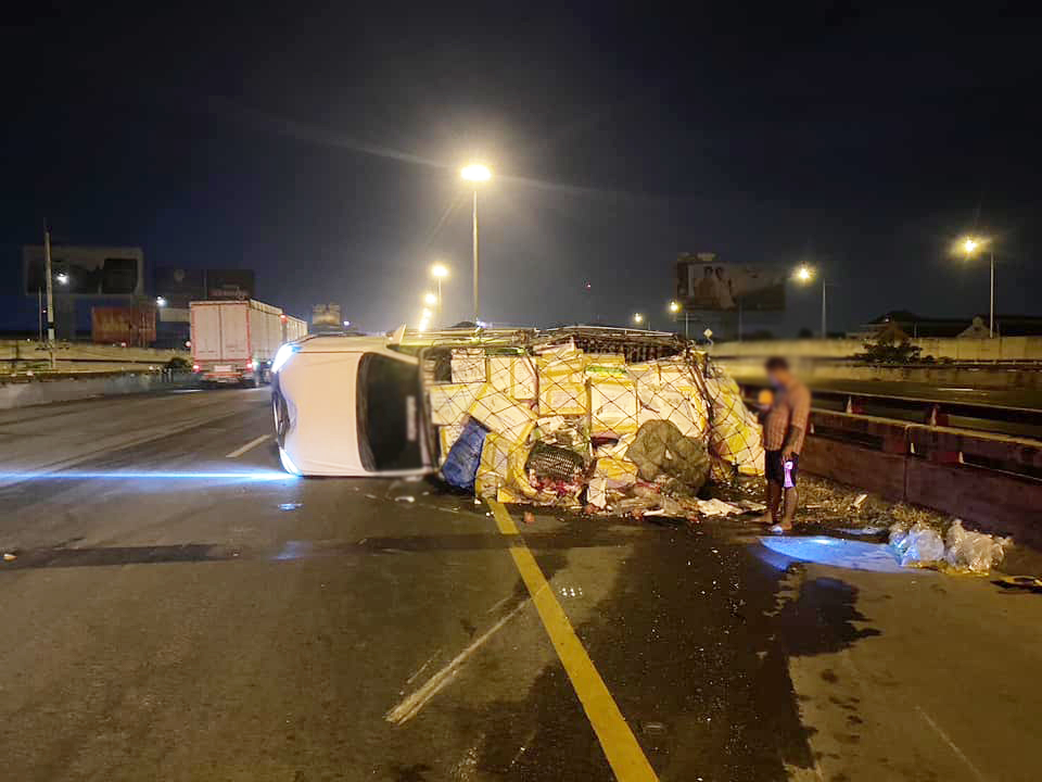 ที่เกิดเหตุ พบรถกระบะ 3 คันชนกัน และมี 2 คันพลิกตะแคง ทำให้วัตถุดิบและสินค้าตกลงบนถนน ตรวจสอบไม่พบผู้บาดเจ็บหรือเสียชีวิต การจราจรผ่านได้เลนซ้าย, กลาง