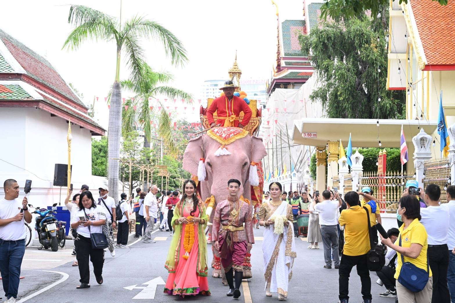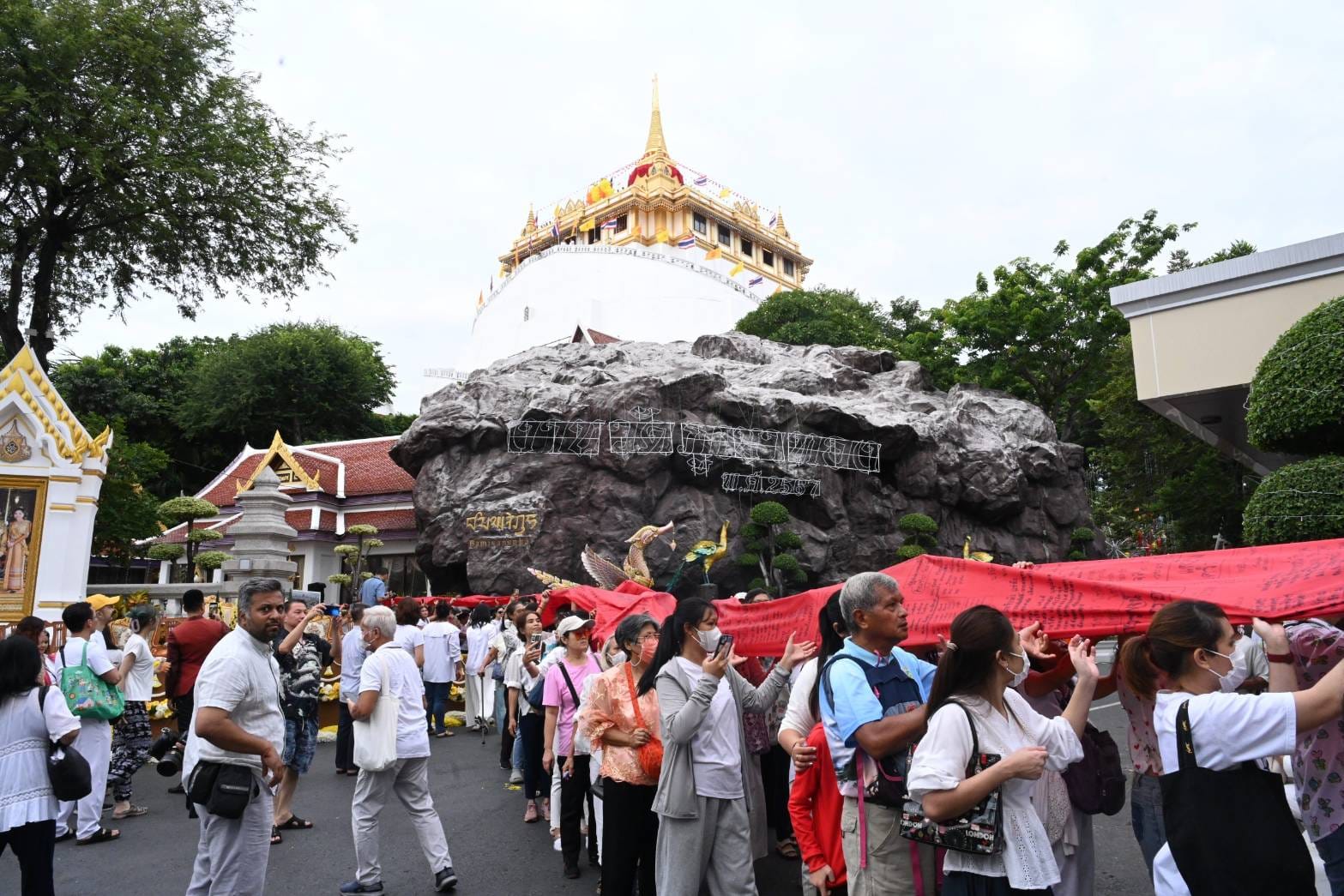 พิธีอัญเชิญผ้าแดงขึ้นห่มองค์พระเจดีย์พระบรมบรรพต เพื่อบูชาพระบรมสารีริกธาตุ ตรงกับวันศุกร์ที่ 8 พฤศจิกายน 2567 ขึ้น 8 ค่ำ เดือน 12 โดยในเวลา 06.00 น. ขบวนอัญเชิญผ้าแดง เคลื่อนออกจากลานโพธิ์ลังกา หน้าพระอุโบสถวัดสระเกศราชวรมหาวิหาร สำหรับขบวนอัญเชิญผ้าแดง ประกอบด้วย ขบวนเชิญป้ายงานนมัสการพระบรมสารรีริกธาตุ ประจำปี 2567 ขบวนวงดุริยางค์ของโรงเรียนวัดสระเกศ ขบวนเชิญธงชาติ ธงธรรมจักร และตราสัญลักษณ์ วปร. ขบวนเทพธิดาเชิญพานดอกไม้ ขบวนช้างมงคล 3 เชือก ขบวนกลองยาว ขบวนหัวโต ขบวนผีตาโขน ขบวนนางรำ ขบวนพญานาค ขบวนรถคลาสสิค ขบวนป้ายพิธีอัญเชิญผ้าแดงขึ้นห่มองค์พระเจดีย์บรมบรรพต ขบวนคนไทยเชื้อสายอินเดีย นุ่งห่มชุดส่าหรี่ ขบวนรถบุปผชาติอัญเชิญผ้าแดง พร้อมเทวดายืนประจำยาม 4 ทิศ ขบวนพุทธศาสนิกชนถือสายมงคล เคลื่อนตามริ้วขบวน