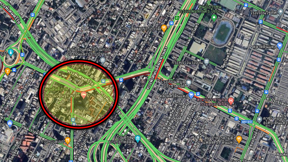เบี่ยงการจราจรใช้พื้นราบ ผ่านแยกได้ตามสัญญาณไฟจราจรที่แยก ถนนดินแดง เคลื่อนตัวได้ช้า มีท้ายสะสมถึงแยกใต้ด่วนฯ ดินแดง