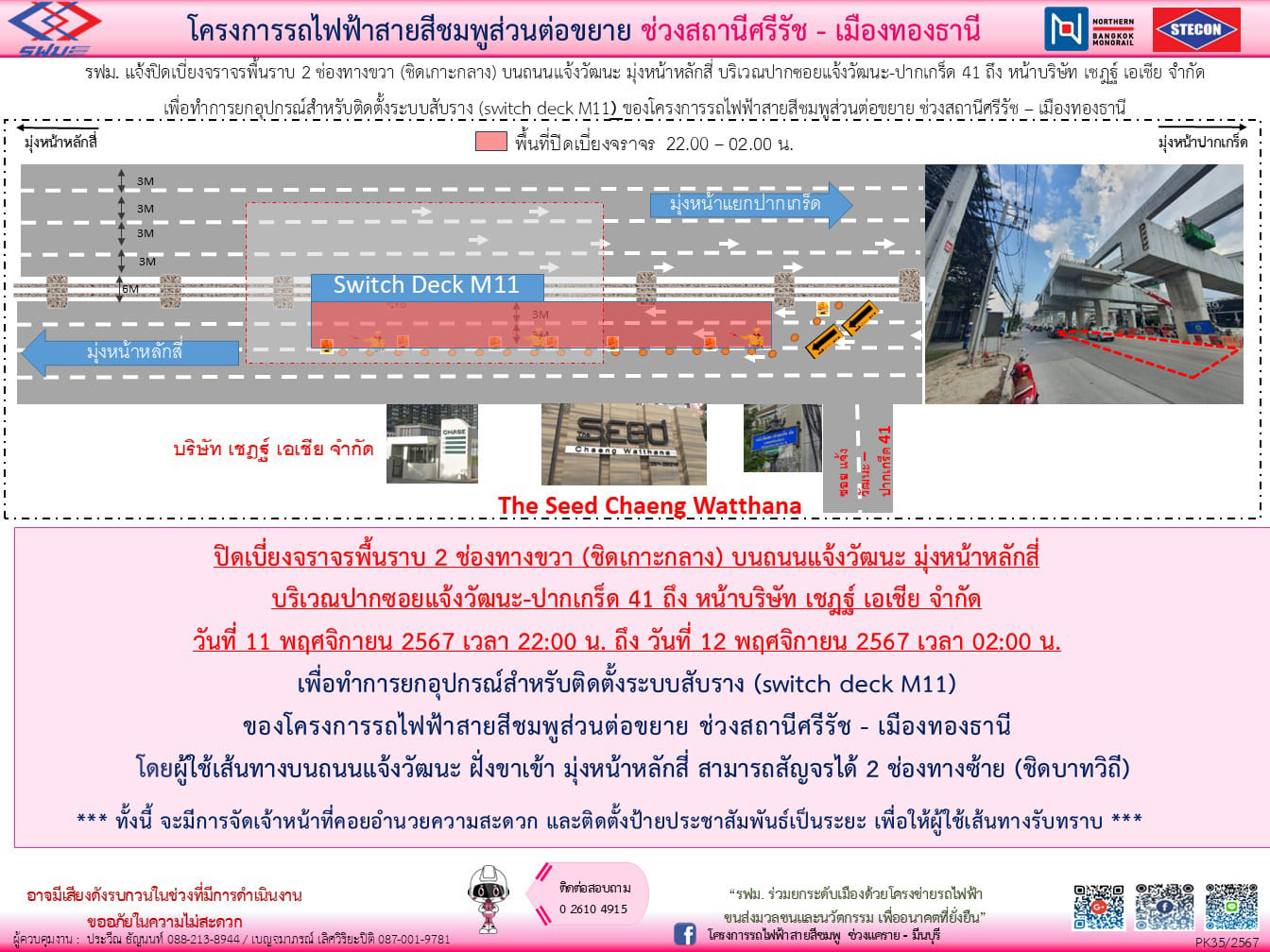 การรถไฟฟ้าขนส่งมวลชนแห่งประเทศไทย (รฟม.) แจ้งว่า บริษัท ซิโน-ไทย เอ็นจีเนียริ่ง แอนด์ คอนสตรัคชั่น จำกัด (มหาชน) ผู้รับจ้างก่อสร้างงานโยธา ของโครงการรถไฟฟ้าสายสีชมพูส่วนต่อขยาย ช่วงสถานีศรีรัช – เมืองทองธานี มีความจำเป็นต้องปิดเบี่ยงจราจรบนพื้นราบ 2 ช่องทางขวา (ชิดเกาะกลาง) บนถนนแจ้งวัฒนะ มุ่งหน้าหลักสี่ บริเวณปากซอยแจ้งวัฒนะ - ปากเกร็ด 41 ถึง หน้าบริษัท เชฏฐ์ เอเชีย จำกัด ในวันที่ 11 พฤศจิกายน 2567 เวลา 22.00 น. ถึง วันที่ 12 พฤศจิกายน 2567 เวลา 02.00 น. เพื่อทำการยกอุปกรณ์สำหรับติดตั้งระบบสับราง (switch deck M11) ของโครงการรถไฟฟ้าสายสีชมพูส่วนต่อขยาย ช่วงสถานีศรีรัช – เมืองทองธานี โดยผู้ใช้เส้นทางบนถนนแจ้งวัฒนะ ฝั่งขาเข้า มุ่งหน้าหลักสี่ สามารถสัญจรได้ 2 ช่องทางซ้าย (ชิดบาทวิถี)
