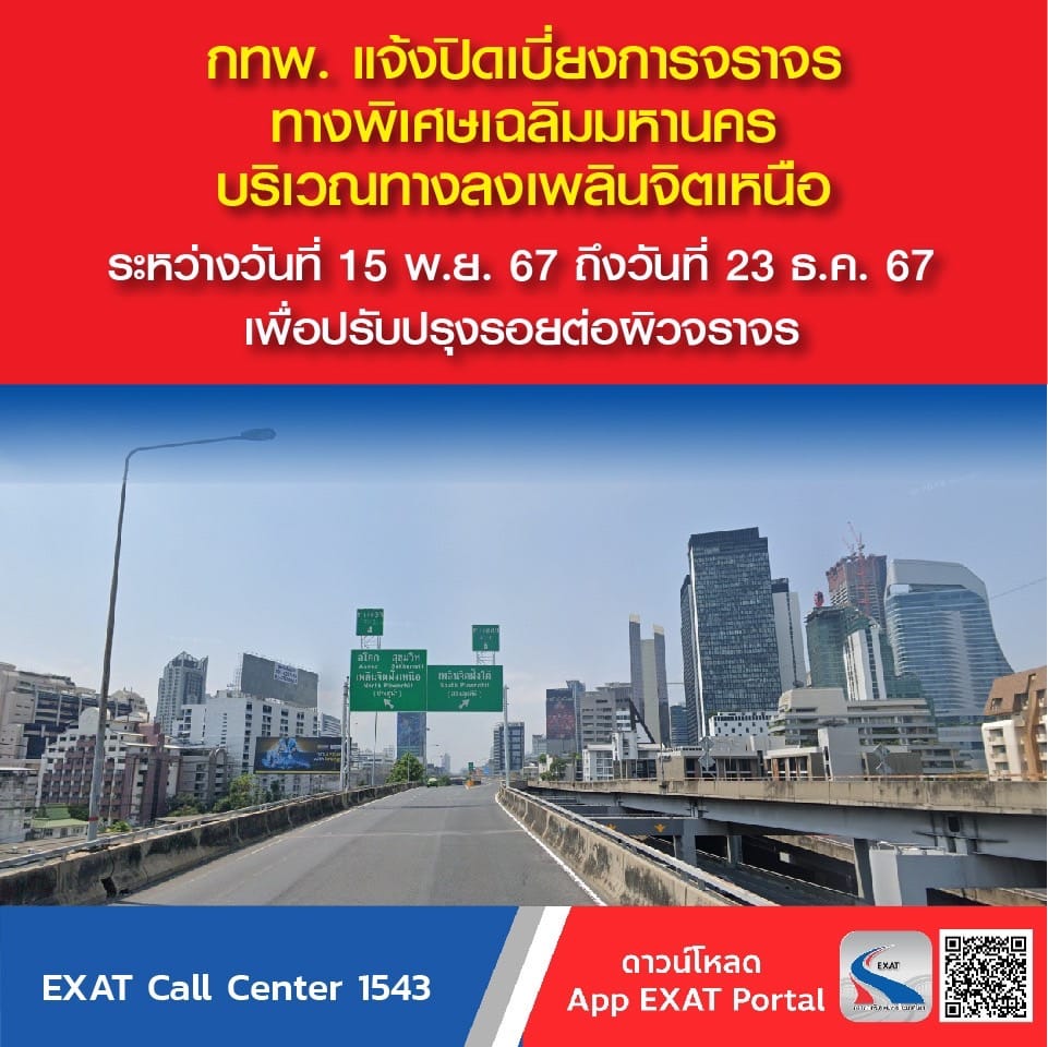 กทพ. แจ้งปิดเบี่ยงการจราจร ทางพิเศษเฉลิมมหานคร บริเวณทางลงเพลินจิตเหนือ เพื่อปรับปรุงรอยต่อผิวจราจร ระหว่างวันที่ 15 พฤศจิกายน 2567 ถึงวันที่ 23 ธันวาคม 2567 (เฉพาะวันศุกร์ ถึง วันอาทิตย์)