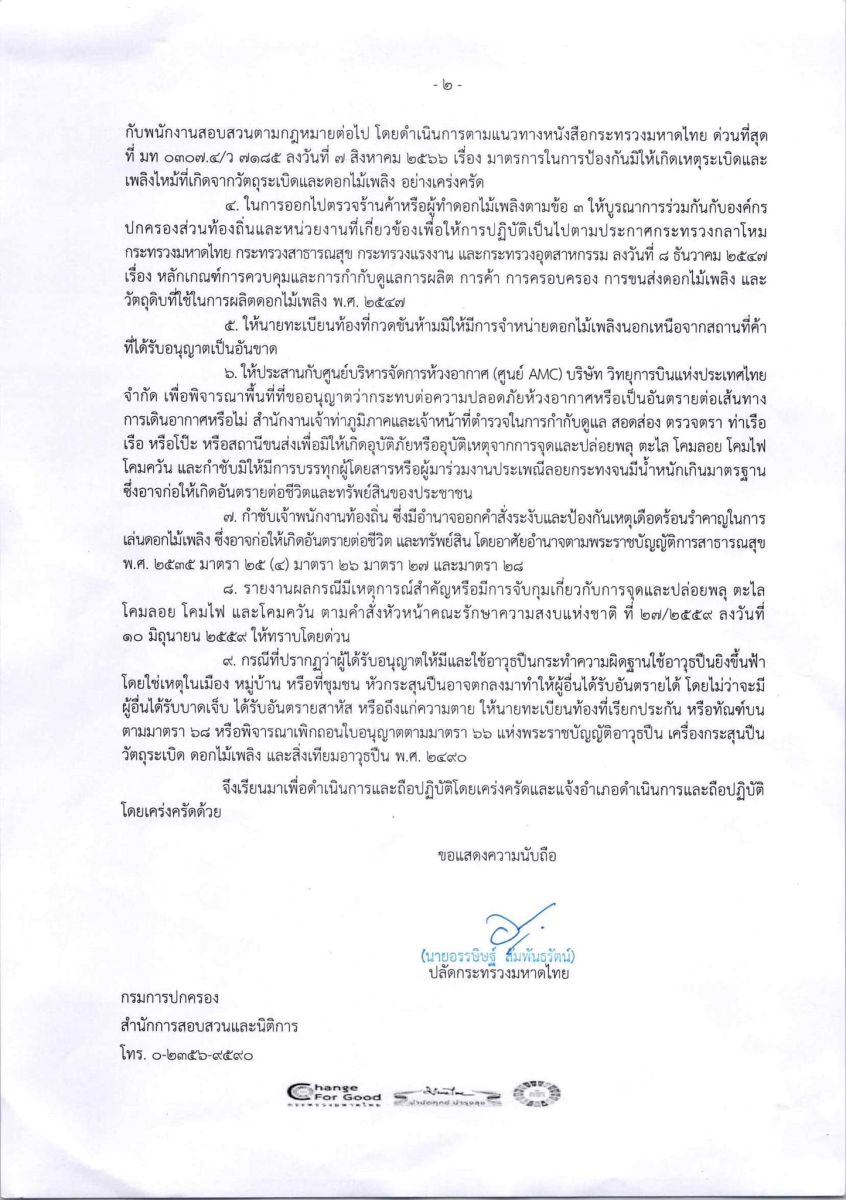 มท.1 สั่งเข้มช่วงเทศกาลลอยกระทง กำชับทุกพื้นที่กวดขัน พลุ ดอกไม้เพลิง โคมลอย และห้ามยิงปืนขึ้นฟ้า ฝ่าฝืนมีบทลงโทษตามกฎหมายเด็ดขาด