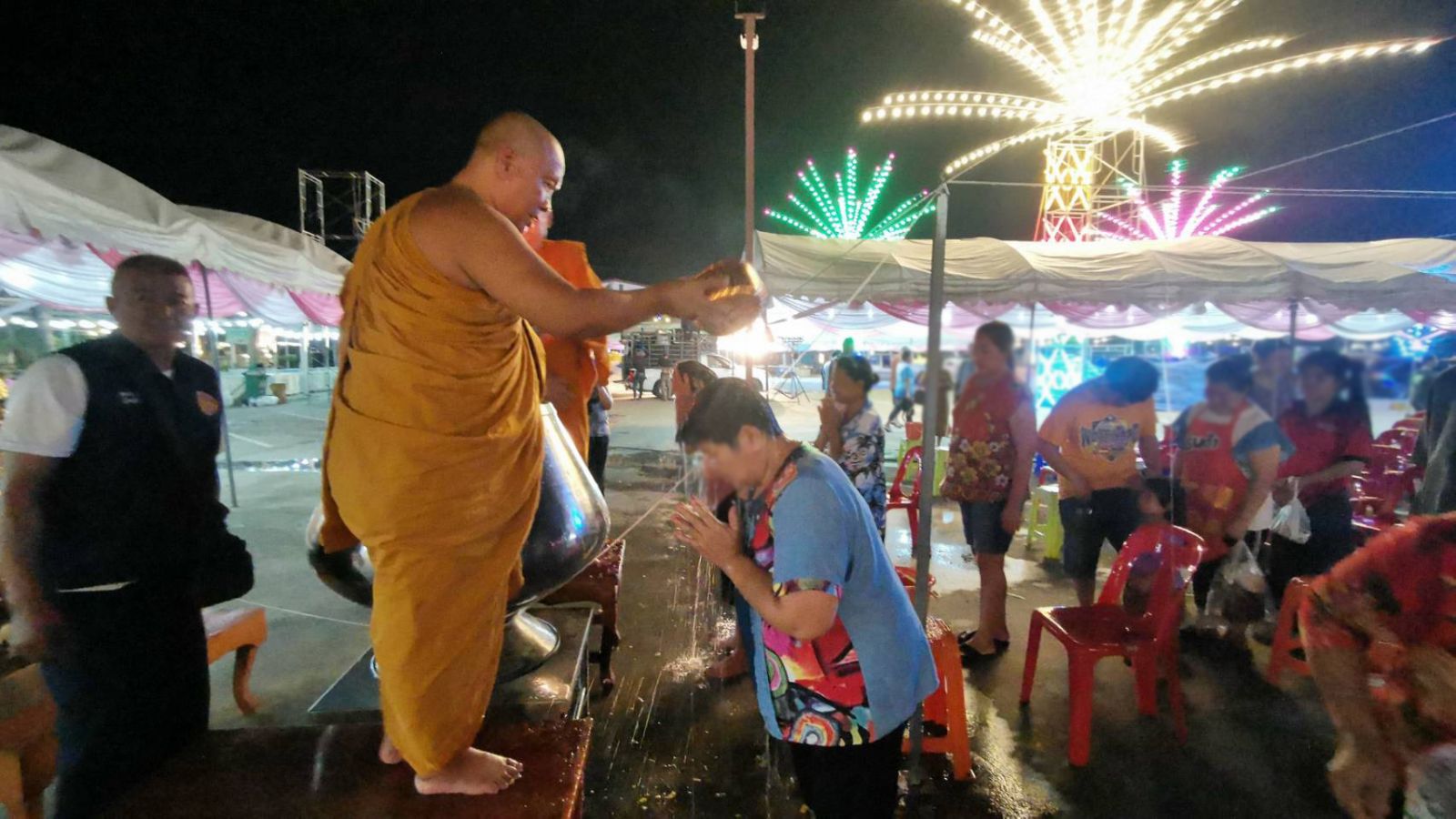 ทั้งนี้ทางวัดได้นำบาตรน้ำมนต์ สูงกว่า 1 เมตร ปักด้วยเทียนชัยทำด้วยขี้ผึ้ง มีพระสงฆ์ 9 รูป สวดเจริญพระพุทธมนต์ หลังจากเสร็จพิธีได้มีประชาชนทยอยเข้าแถวเป็นจำนวนมาก เพื่อให้พระสงฆ์ตักนำมนต์รดจากศีรษะ