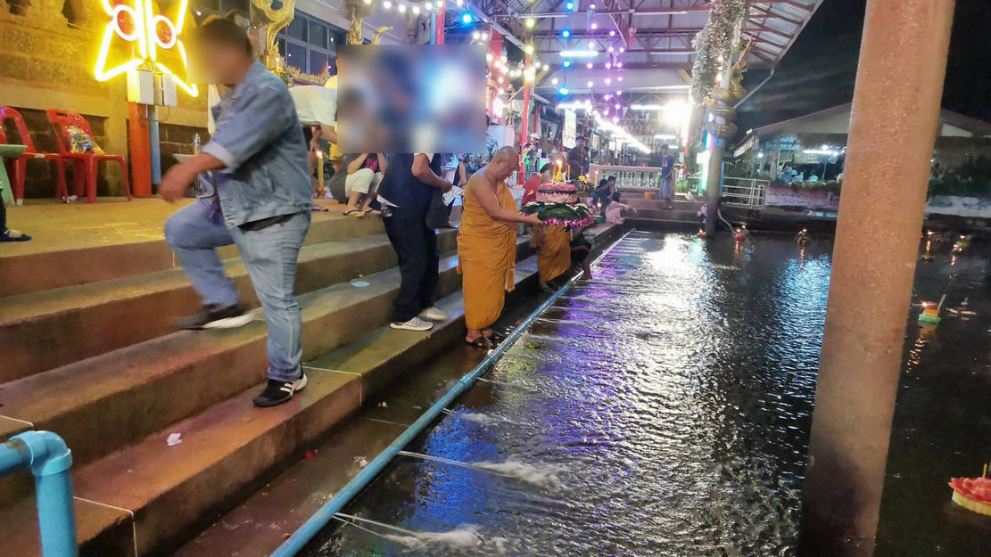 ประชาชนแห่อาบน้ำมนต์จันทร์เพ็ญวันลอยกระทง วัดไทรน้อย ติดท่อพีวีซีแรงดันน้ำผลักกระทงลงคลอง จ.นนทบุรี