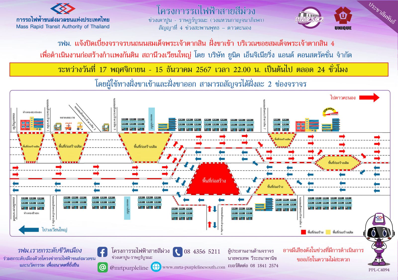 การรถไฟฟ้าขนส่งมวลชนแห่งประเทศไทย (รฟม.) แจ้งว่า บริษัท ยูนิค เอ็นจิเนียริ่ง แอนด์ คอนสตรัคชั่น จำกัด (มหาชน) ผู้รับจ้างงานออกแบบและก่อสร้างอุโมงค์ทางวิ่งและสถานีใต้ดิน โครงการรถไฟฟ้าสายสีม่วง ช่วงเตาปูน - ราษฎร์บูรณะ (วงแหวนกาญจนาภิเษก) สัญญาที่ 4 ช่วงสะพานพุทธ - ดาวคะนอง มีความจำเป็นต้องปิดเบี่ยงจราจรบนถนนสมเด็จพระเจ้าตากสิน ฝั่งขาเข้า บริเวณซอยสมเด็จพระเจ้าตากสิน 4 เพื่อดำเนินงานก่อสร้างกำแพงกันดิน สถานีวงเวียนใหญ่ ระหว่างวันที่ 17 พฤศจิกายน – 15 ธันวาคม 2567 เวลา 22.00 น. เป็นต้นไป ตลอด 24 โดยผู้ใช้ทางฝั่งขาเข้าและฝั่งขาออก สามารถสัญจรได้ฝั่งละ 2 ช่องจราจร