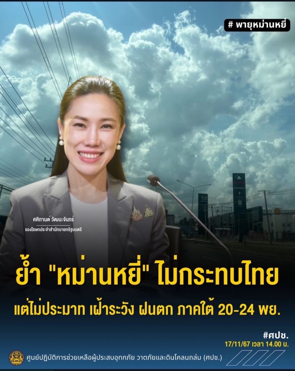 วันนี้ (17 พฤศจิกายน 2567) เวลา 14.00 น. นางสาวศศิกานต์ วัฒนะจันทร์ รองโฆษกประจำสำนักนายกรัฐมนตรี เปิดเผยว่า นายภูมิธรรม เวชยชัย รองนายกรัฐมนตรีและรัฐมนตรีว่าการกระทรวงกลาโหม ในฐานะผู้อำนวยการศูนย์ปฏิบัติการช่วยเหลือผู้ประสบอุทกภัย วาตภัย และดินโคลนถล่ม หรือ ศปช. ได้สั่งการให้ติดตามผลกระทบจากพายุไต้ฝุ่น "หม่านหยี่" (MAN-YI) ซึ่งล่าสุดมีศูนย์กลางบริเวณตะวันออกของประเทศฟิลิปปินส์ คาดว่าจะเคลื่อนเข้าสู่ทะเลจีนใต้ในวันพรุ่งนี้ (18 พ.ย.) และจะสลายตัวเมื่อเข้าใกล้ชายฝั่งเวียดนาม โดยกรมอุตุนิยมวิทยายืนยันว่า พายุดังกล่าวจะไม่มีผลกระทบต่อประเทศไทย