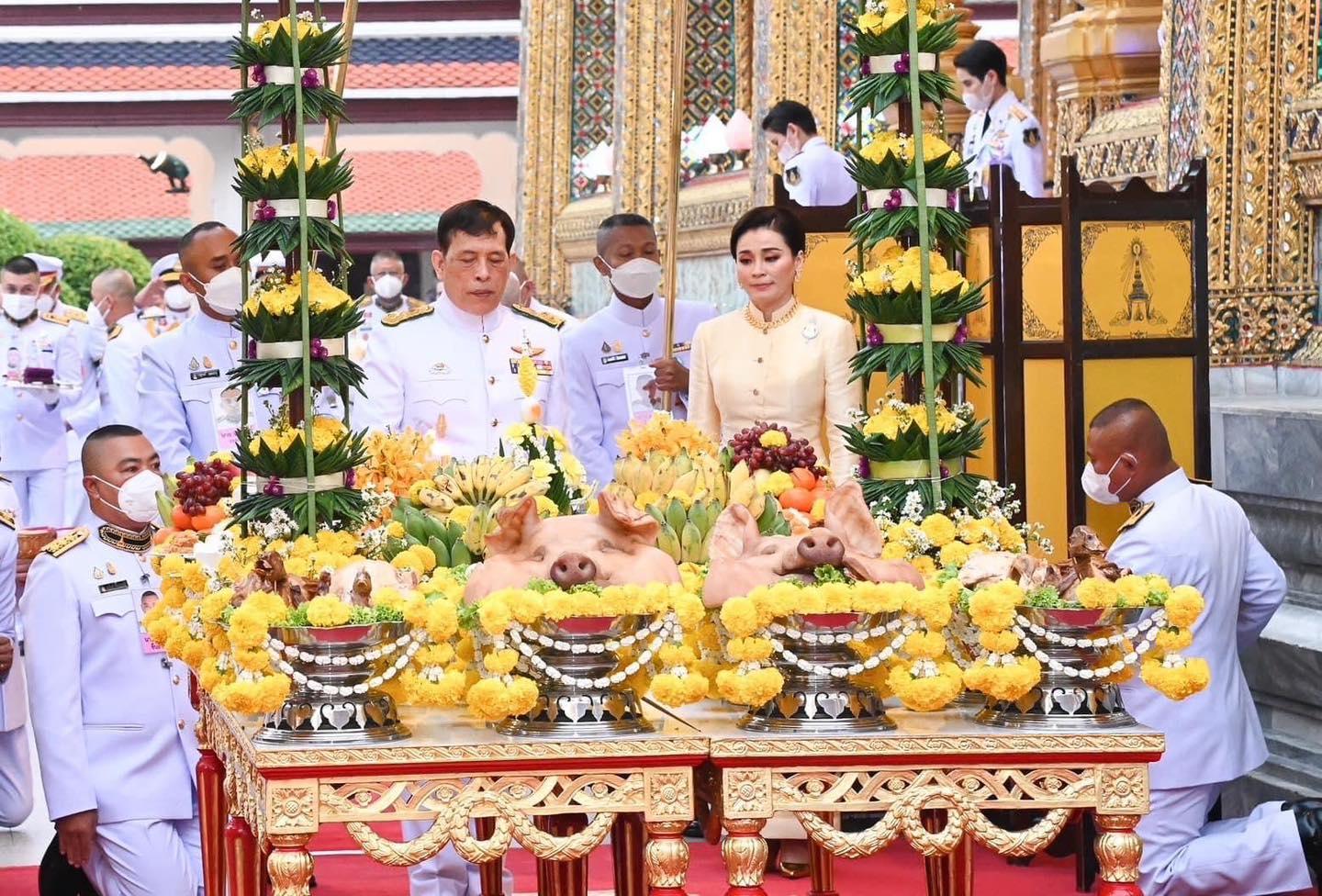 พระบาทสมเด็จพระเจ้าอยู่หัว ทรงตั้งพระราชสัตยาธิษฐาน ขอถวายเครื่องสักการะ ทรงโปรยข้าวตอกดอกไม้ ที่โต๊ะเครื่องบวงสรวงสังเวย เสด็จฯไปยังมณฑลพิธีเททอง ทรงรับแผ่นทอง แล้วทรงหย่อนลงในช้อนที่เจ้าพนักงานพระราชพิธีถือถวาย สมเด็จพระนางเจ้าฯ พระบรมราชินี ทรงรับแผ่นทอง แล้วทรงหย่อนลงในช้อนที่เจ้าพนักงานพระราชพิธีถือถวาย พระบาทสมเด็จพระเจ้าอยู่หัว ทรงรับช้อนจากเจ้าพนักงานพระราชพิธี ทรงเทแผ่นทองลงในเบ้า แล้วพระราชทานช้อนคืนเจ้าพนักงานพระราชพิธี