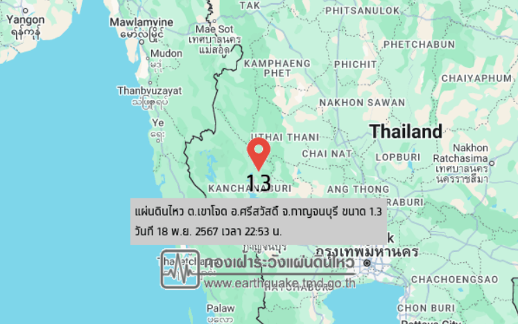 เวลา 22.53 น. วันที่ 18 พฤศจิกายน 2567 กองเฝ้าระวังแผ่นดินไหว กรมอุตุนิยมวิทยา แจ้งเหตุ แผ่นดินไหว ขนาด 1.3 ความลึก 2 กม. ภายในพื้นที่ของ ต.เขาโจด อ.ศรีสวัสดิ์ จ.กาญจนบุรี (14.87°N,99.13°E) ขณะนี้ยังไม่มีรายงานผลกระทบจากแรงสั่นสะเทือน