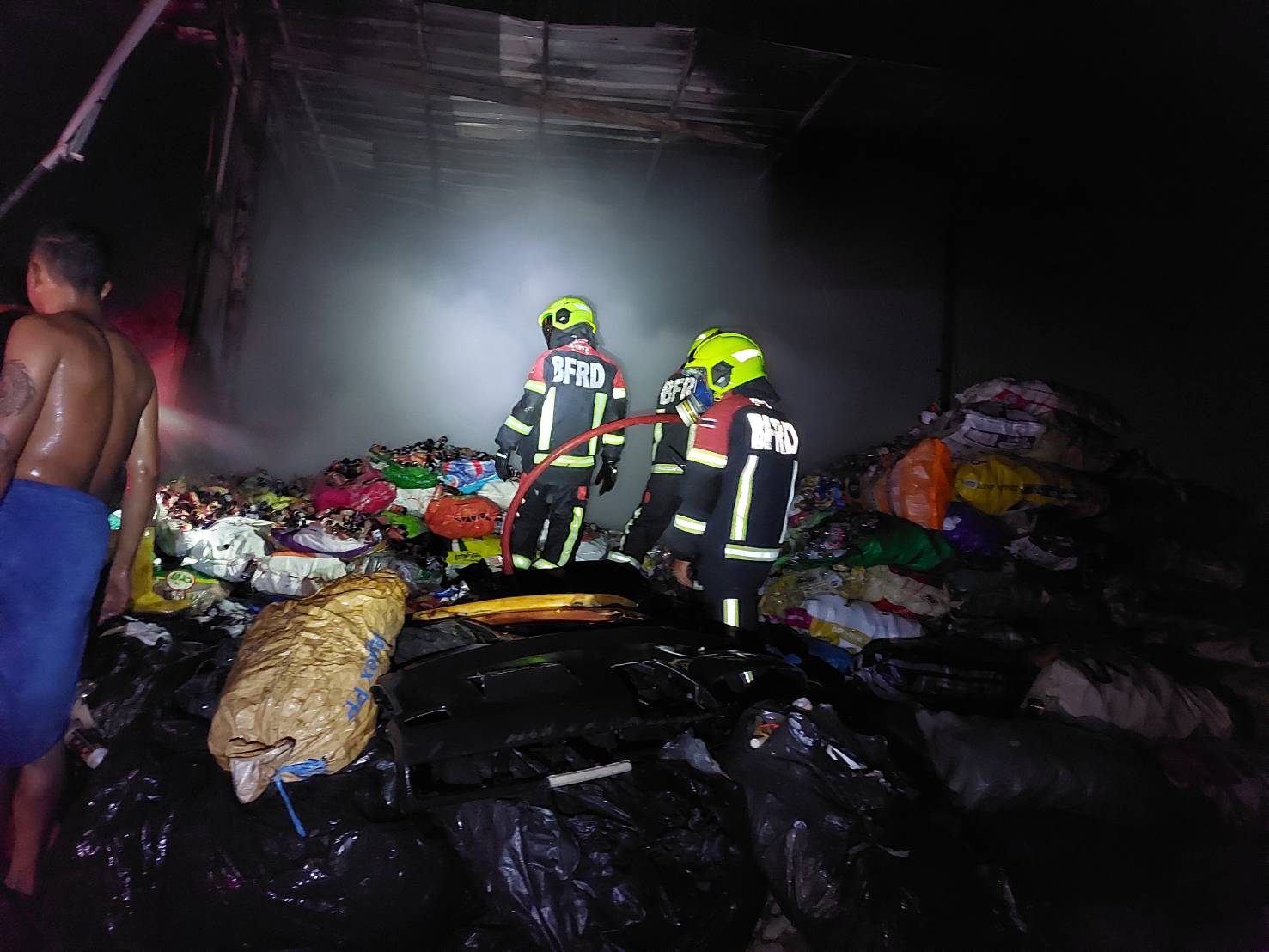 เพลิงไหม้โกดังเก็บของเก่า ย่านประชาอุทิศ 72 ทุ่งครุ เจ้าหน้าที่อาสาบรรเทาสาธารณภัยดำเนินการใช้น้ำดับทันก่อนจะลุกลาม