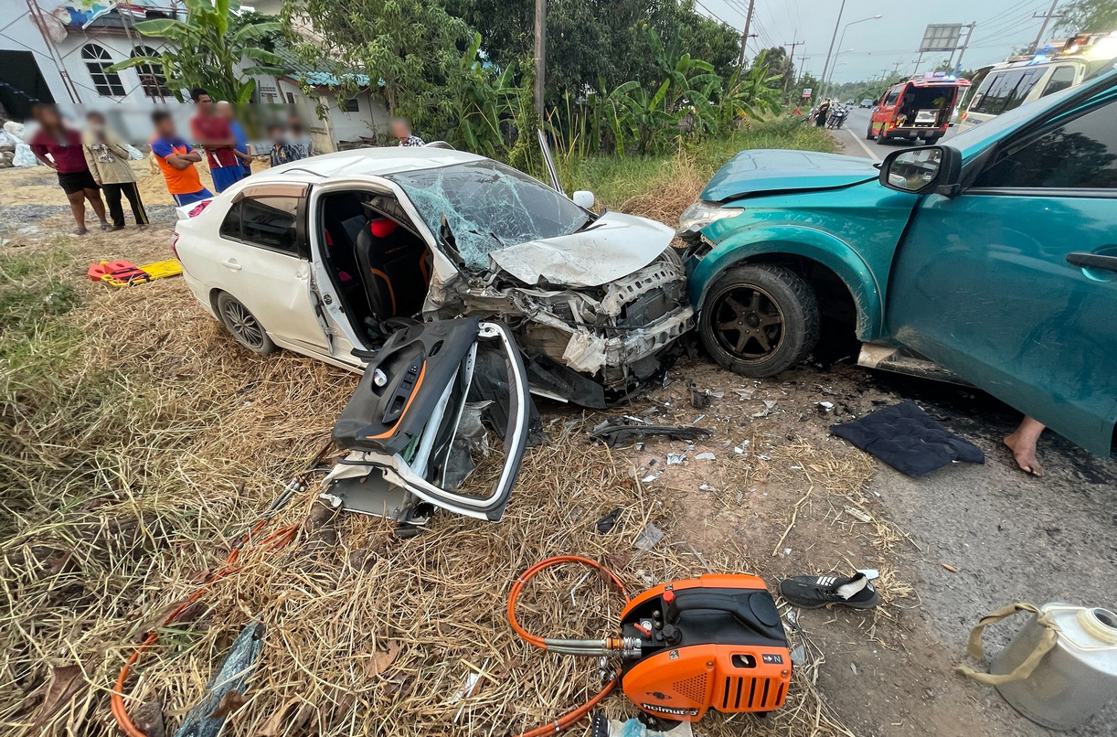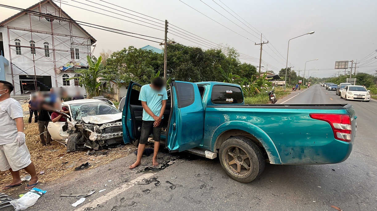 หนุ่มขับกระบะก้มหยิบโทรศัพท์ เงยหน้าอีกที ชนประสานงากับรถเก๋งเคราะห์ร้าย มีผู้บาดเจ็บหลายราย จ.นครนายก