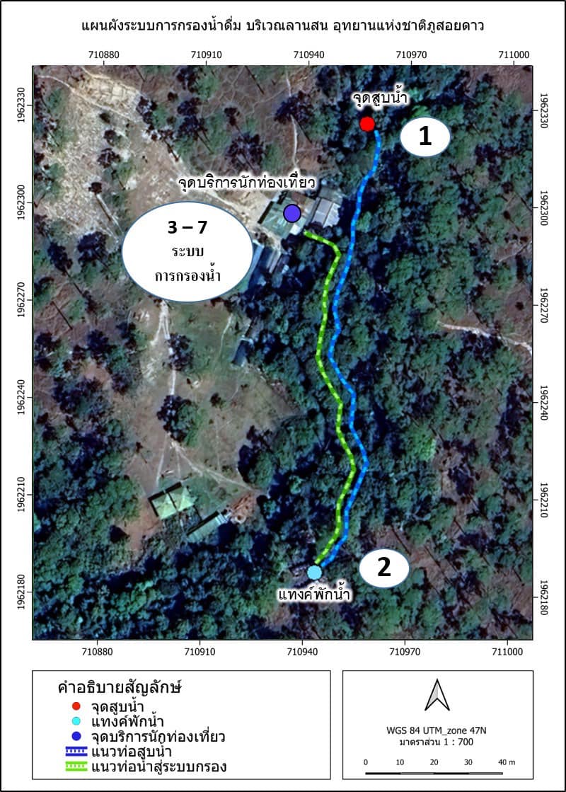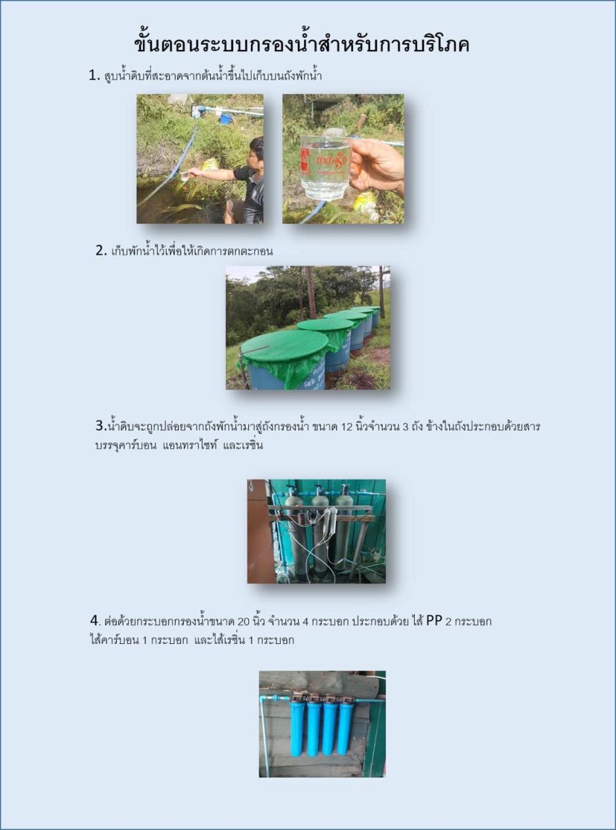 1. น้ำที่สูบขึ้นมาใส่ถังพักเพื่อปล่อยลงมาให้นักท่องเที่ยวอุปโภคนั้น สูบมาจากบริเวณต้นน้ำ แล้วมาพักไว้ที่ถังเก็บน้ำหลังห้องน้ำ/ห้องอาบน้ำ บนเนินเพื่อปล่อยลงมายังห้องน้ำบริการนักท่องเที่ยว มิได้สูบจากบริเวณหลังห้องน้ำ