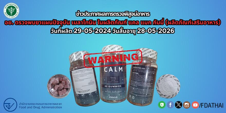 สำนักงานคณะกรรมการอาหารและยา (อย.) ได้ตรวจสอบสถานที่นำเข้าอาหารเพื่อจำหน่ายของ บริษัท ไวท์แลป เอสเซนเชียลส์ จำกัด เมื่อวันที่ 24 กรกฎาคม 2567 และได้เก็บตัวอย่างผลิตภัณฑ์อาหารส่งตรวจวิเคราะห์ที่กรมวิทยาศาสตร์การแพทย์ โดยฉลากระบุรายละเอียดผลิตภัณฑ์ “แคล แมก กัมมี่ (ผลิตภัณฑ์เสริมอาหาร) (ตรา เซเวินทีเซเวิน) เลขสารบบอาหาร 10-3-08767-5-0003 วันที่ผลิต 29-05-2024 วันสิ้นอายุ 28-05-2026 ขนาดบรรจุ 180 กรัม 60 ชิ้น