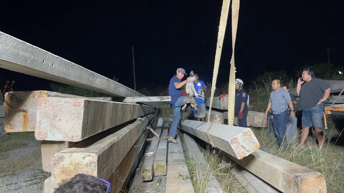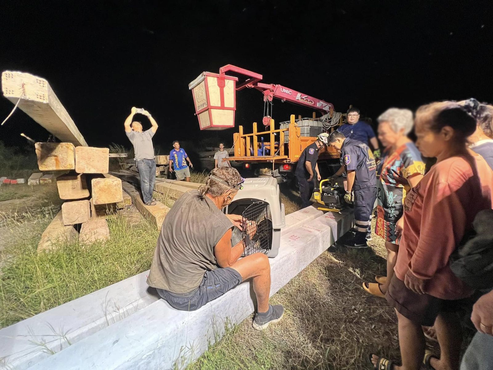 กู้ภัย เทศบาล พลเมืองดี ประสานรถเครนยกเสาปูน ช่วยชีวิตสุนัขจร หลังเข้าไปติดในซอกเสาเป็นเวลานาน จ.ชลบุรี