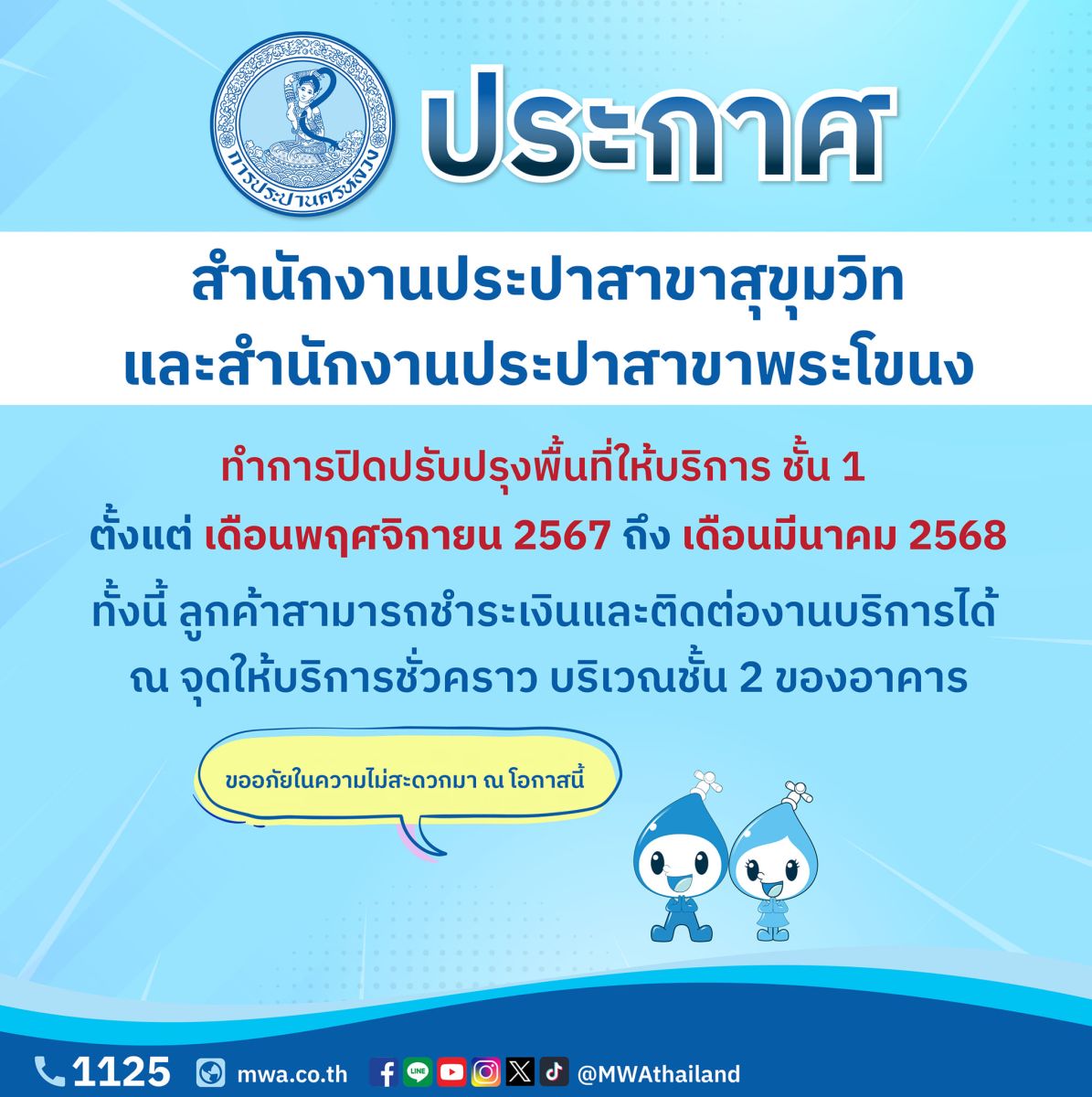 ย้ำ! กปน. แจ้งปิดปรับปรุงพื้นที่ให้บริการ ชั้น 1 สำนักงานประปาสาขาพระโขนง และสุขุมวิท ตั้งแต่ พฤศจิกายน 2567 - มีนาคม 2568 ลูกค้าสามารถใช้บริการ ณ จุดบริการชั่วคราว บริเวณชั้น 2 จุดบริการ จอด จ่าย จร หรือ ผ่านช่องทางออนไลน์ และสาขาใกล้เคียง