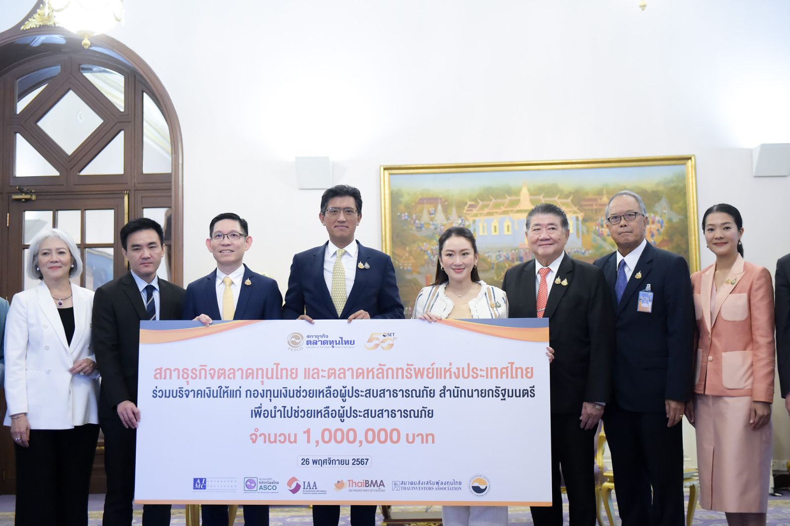 (26 พฤศจิกายน 2567) เวลา 12.00 น. ณ ห้องสีม่วง ตึกไทยคู่ฟ้า ทำเนียบรัฐบาล นางสาวแพทองธาร ชินวัตร นายกรัฐมนตรี เป็นประธานรับมอบเงินบริจาคเพื่อช่วยเหลือผู้ประสบอุทกภัยจังหวัดเชียงราย จำนวน 1,000,000 บาท จาก นายอัสสเดช คงสิริ กรรมการและผู้จัดการตลาดหลักทรัพย์แห่งประเทศไทย และสภาธุรกิจตลาดทุนไทย ซึ่งบริจาคผ่านกองทุนเงินช่วยเหลือผู้ประสบสาธารณภัย สำนักนายกรัฐมนตรี เพื่อนำไปช่วยเหลือผู้ประสบสาธารณภัยต่อไป โดยมีนายภูมิธรรม เวชยชัย รองนายกรัฐมนตรีและรัฐมนตรีว่าการกระทรวงกลาโหม นายชูศักดิ์ ศิรินิล รัฐมนตรีประจำสำนักนายกรัฐมนตรี นายพิชัย นริพทะพันธุ์ รัฐมนตรีว่าการกระทรวงพาณิชย์ นางสาวธีรรัตน์ สำเร็จวาณิชย์ รัฐมนตรีช่วยว่าการกระทรวงมหาดไทย เข้าร่วม