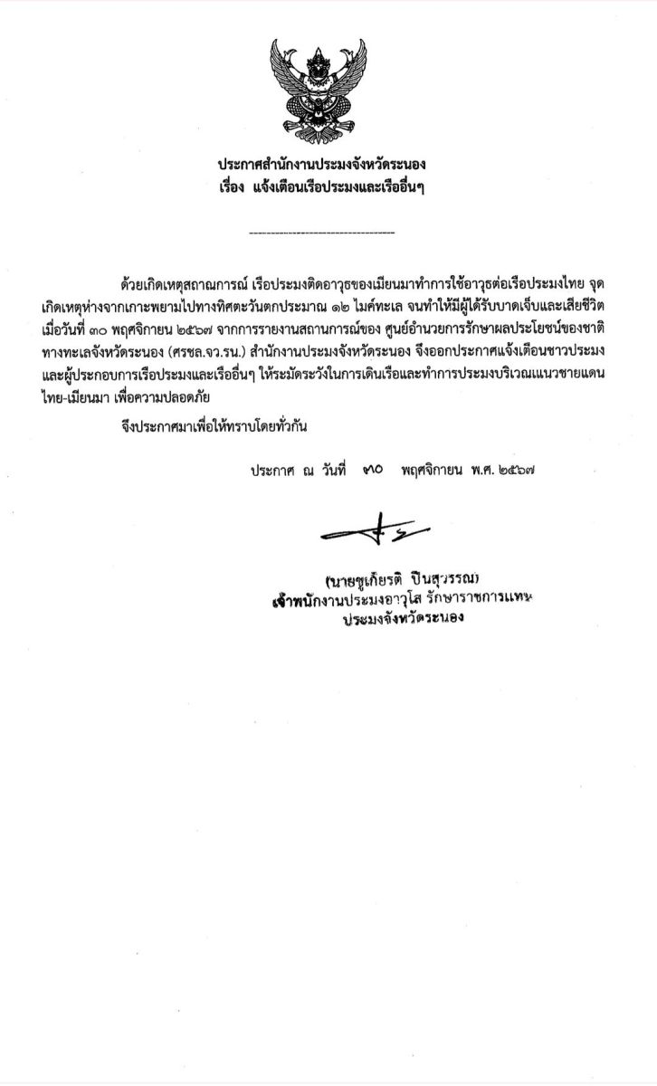สำนักงานประมงระนอง แจ้งเตือนเรืออื่นๆระมัดระวัง วันที่ 30 พ.ย.2567 สำนักงานประมงจังหวัดระนอง ออกประกาศ เรื่อง แจ้งเตือนเรือประมงและเรืออื่นๆ โดยระบุว่าด้วยเกิดเหตุสถานการณ์ เรือประมงติดอาวุธของเมียนมาทำการใช้อาวุธต่อเรือประมงไทย จุดเกิดเหตุห่างจากเกาะพยามไปทางทิศตะวันตกประมาณ 12 ไมค์ทะเล จนทำให้มีผู้ได้รับบาดเจ็บและเสียชีวิต เมื่อวันที่ 30 พฤศจิกายน 2567 จากการรายงานสถานการณ์ของศูนย์อำนวยการรักษาผลประโยชน์ของชาติทางทะเลจังหวัดระนอง (ศรชล.จว.รน.) สำนักงานประมงจังหวัดระนอง จึงออกประกาศแจ้งเตือนชาวประมงและผู้ประกอบการเรือประมงและเรืออื่นๆ ให้ระมัดระวังในการเดินเรือและทำการประมงบริเวณแนวชายแดนไทย-เมียนมา เพื่อความปลอดภัย อย่างไรก็ตามมีรายงานว่ากรณีดังกล่าว เรือประมงไทย ถูกเรือประมงติดอาวุธของเมียนมายิง 3 ลำ ประกอบด้วยเรือดวงทวีผล 333 เรือ ส.เจริญชัย 8 และเรือมหาลาภธนวัฒน์ 4 ขณะทำการประมงในน่านน้ำไทย ห่างทางทิศตะวันตกของเกาะพยาม ประมาณ 12 ไมล์ ประมาณ แลต 9 องศา 45 ลิบดา, ลอง 98 องศา 17 ลิปดา
