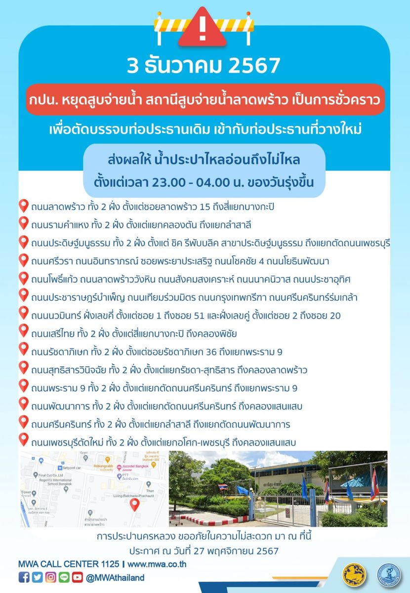 การประปานครหลวง (กปน.) มีความจำเป็นต้องหยุดสูบจ่ายน้ำ สถานีสูบจ่ายน้ำลาดพร้าว เป็นการชั่วคราว เพื่อตัดบรรจบท่อประธานเดิม เข้ากับท่อประธานที่วางใหม่ บริเวณสถานีสูบจ่ายน้ำลาดพร้าว ในคืนวันอังคารที่ 3 ธันวาคม 2567 ตั้งแต่เวลา 23.00 - 04.00 น. ของวันรุ่งขึ้น เพื่อให้ประชาชนได้รับบริการน้ำประปาอย่างเพียงพอและทั่วถึง โดยระหว่างดำเนินการ ส่งผลให้ น้ำประปาไหลอ่อนถึงไม่ไหล ในพื้นที่ดังต่อไปนี้