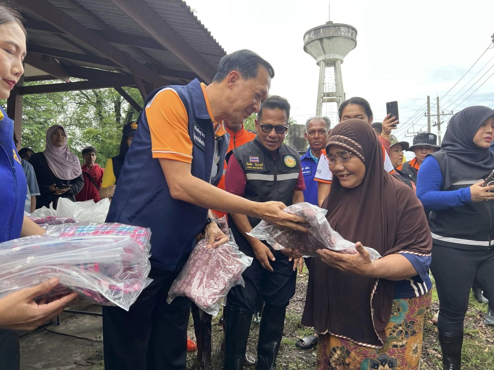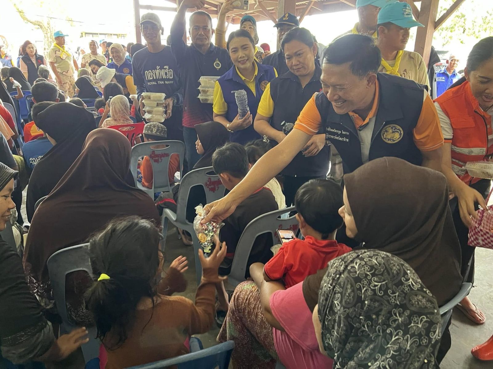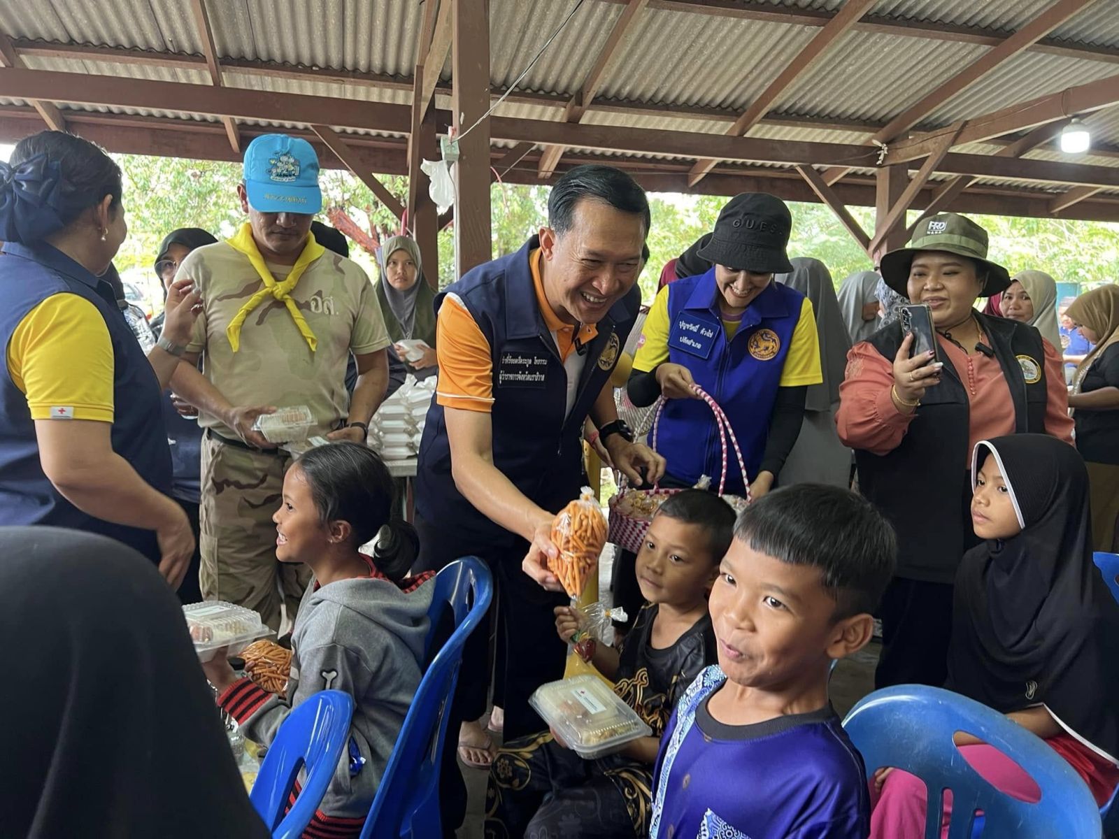 จากนั้น จึงเดินทางต่อไปยังศูนย์พักพิงชั่วคราวช่วยเหลือผู้อพยพ ศูนย์พัฒนาเด็กเล็กบ้านพรุกาบแดง ม.7 ต.ไพรวัน อ.ตากใบ จ.นราธิวาส มอบข้าวกล่อง จำนวน 200 กล่อง และมอบถุงยังชีพจากสภากาชาด ไทย ยาเวชภัณฑ์ ผ้านุ่งโสร่งแก่ผู้ประสบภัยภายในศูนย์พักพิงฯ และในพื้นที่ ต.ไพรวัน อ.ตากใบ จ.นราธิวาส