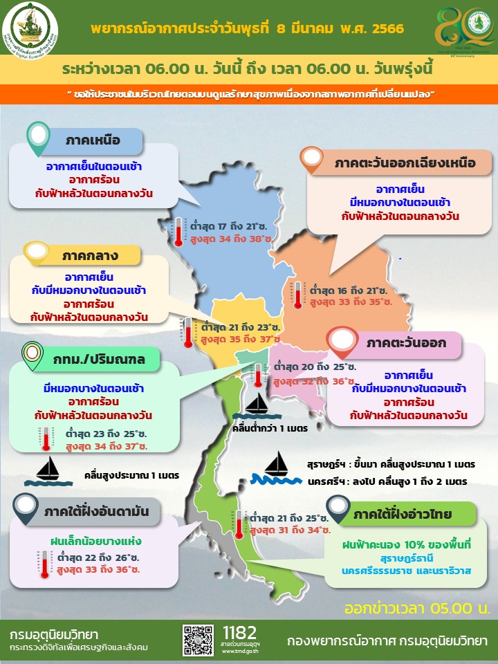 ลักษณะอากาศทั่วไป 8 มีนาคม 2566 พยากรณ์อากาศ 24 ชั่วโมงข้างหน้า บริเวณความกดอากาศสูงหรือมวลอากาศเย็นกำลังอ่อนปกคลุมประเทศไทยตอนบนและทะเลจีนใต้ ส่งผลทำให้มีลมตะวันออกและลมตะวันออกเฉียงใต้พัดเข้ามาปกคลุมประเทศไทยตอนบน แต่ยังคงมีอากาศเย็นในตอนเช้าบริเวณภาคเหนือ ภาคตะวันออกเฉียงเหนือ ภาคกลาง และภาคตะวันออก ขอให้ประชาชนในบริเวณดังกล่าวดูแลรักษาสุขภาพเนื่องจากสภาพอากาศที่เปลี่ยนแปลงในระยะนี้ไว้ด้วย