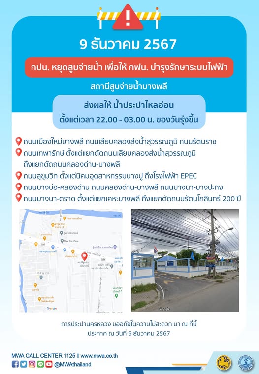 การประปานครหลวง (กปน.) มีความจำเป็นต้องหยุดสูบจ่ายน้ำ สถานีสูบจ่ายน้ำบางพลี เป็นการชั่วคราว ในคืนวันจันทร์ที่ 9 ธันวาคม 2567 ตั้งแต่เวลา 22.00 - 03.00 น. ของวันรุ่งขึ้น เพื่อให้การไฟฟ้านครหลวง (กฟน.) บำรุงรักษาระบบไฟฟ้า โดยระหว่างดำเนินการ ส่งผลให้ น้ำประปาไหลอ่อน ในพื้นที่ดังต่อไปนี้